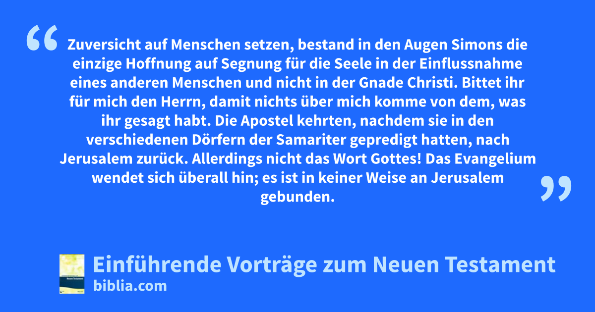 Philippus zog also hinab, indem er Christus predigte. Und die Volksmengen achteten einmütig auf das, was von Philippus geredet wurde, indem sie zuhörten und die Zeichen sahen, die er tat (V. 6). Doch das Zeugnis durch Wunder erreicht oft nur das Fleisch. Wunder sind tatsächlich ein Zeichen an die Ungläubigen; und welche Wirkung sie hervorrufen, zeigt uns der Geist Gottes in dem Kapitel vor uns. Der Herr gibt sie in seiner Gnade als Zeichen, um die sorglosen Herzen der Menschen anzuziehen. Dennoch sind sie gefahrvoll, wenn sie zum Ruheplatz und ausschließlichem Gegenstand der Seele werden. Letzteres war der verhängnisvolle Fehler, der damals gemacht wurde – aber nicht nur damals und dort, sondern auch von vielen Millionen Seelen seit jenen Tagen bis heute. Der Glaube kann niemals auf einer anderen Grundlage ruhen als dem Wort Gottes. Alles andere ist nutzlos und neigt dazu, den Menschen zu verherrlichen und zu verführen. Bei dieser Begebenheit in Samaria wirkte zweifellos der Heilige Geist in einer Kraft, welche unreine Geister austrieb und die Kranken heilte sowie Freude in die Herzen der Menschen jener ganzen Stadt ausbreitete. Augenscheinlich war es die sich damals so reichhaltig enthüllende äußere Entfaltung von Kraft, welche auf die fleischliche Gesinnung des Simon einwirkte. Er selbst hatte den Ruf eines Großen und war bisher das Gefäß einer Art dämonischen Macht gewesen. Es war die elende Macht Satans, mit der er die Augen der Menschen blendete. Als Simon sich jetzt übertroffen sah, versuchte er als ein verschlagener Mann aus dieser ihm überlegenen Kraft nach Möglichkeit Nutzen zu ziehen. Er suchte nicht Christus, sondern sich selbst. Er wollte neuen Einfluss gewinnen und nicht seinen alten verlieren. Warum sollte er nicht diese neue Methode, wenn möglich, zu seinem eigenen Zweck verwenden?