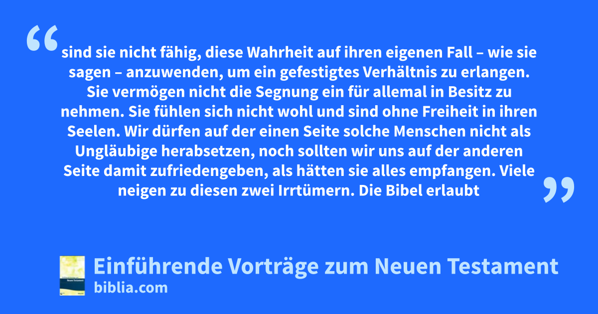 Das sollten wir gut beachten, weil wir auch heute noch Personen in einem vergleichbaren Zustand finden können. Viele Seelen leben keinesfalls in Freiheit und haben noch nicht den Geist der Sohnschaft empfangen. Dennoch können wir sie wahrhaftig als aus Gott geboren anerkennen. Sie hassen die Sünde. Sie lieben die Heiligkeit. Sie verehren wirklich den Herrn Jesus und haben nicht den geringsten Zweifel bezüglich seiner Herrlichkeit und dass Er der Heiland ist. Trotzdem sind sie nicht fähig, diese Wahrheit auf ihren eigenen Fall – wie sie sagen – anzuwenden, um ein gefestigtes Verhältnis zu erlangen. Sie vermögen nicht die Segnung ein für allemal in Besitz zu nehmen. Sie fühlen sich nicht wohl und sind ohne Freiheit in ihren Seelen. Wir dürfen auf der einen Seite solche Menschen nicht als Ungläubige herabsetzen, noch sollten wir uns auf der anderen Seite damit zufriedengeben, als hätten sie alles empfangen. Viele neigen zu diesen zwei Irrtümern. Die Bibel erlaubt keinen von beiden; sie sorgt für jeden Fall in einer vollkommenen Weise.