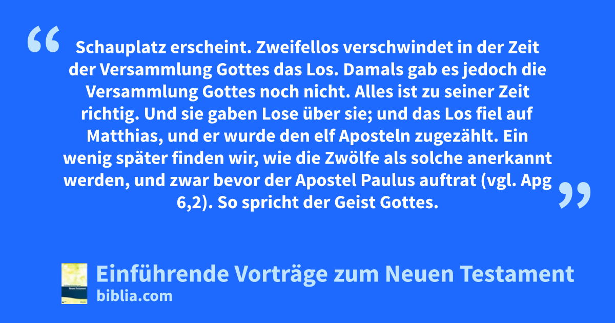 Die Jünger beteten also und sprachen: Du, Herr, Herzenskündiger aller, zeige von diesen beiden den einen an, den du auserwählt hast (V. 24). Kein Mensch wählte jemals einen Apostel. Sogar die Apostel handelten nicht so, denn sie konnten es nicht. Ausschließlich der Herr besaß das Recht dazu; und folglich warfen sie nach jüdischem Brauch Lose. Die zwölf Apostel stehen nach meiner Meinung eindeutig in Beziehung zu den zwölf Stämmen Israels. Und sie gaben Lose über sie (V. 26). Diese Handlungsweise war von Gott im Alten Testament gebilligt worden, als Israel noch vor Ihm stand. Sie wird auch wieder von Ihm erlaubt werden, wenn Israel in den letzten Tagen erneut auf dem Schauplatz erscheint. Zweifellos verschwindet in der Zeit der Versammlung Gottes das Los. Damals gab es jedoch die Versammlung Gottes noch nicht. Alles ist zu seiner Zeit richtig. Und sie gaben Lose über sie; und das Los fiel auf Matthias, und er wurde den elf Aposteln zugezählt. Ein wenig später finden wir, wie die Zwölfe als solche anerkannt werden, und zwar bevor der Apostel Paulus auftrat (vgl. Apg 6,2). So spricht der Geist Gottes.