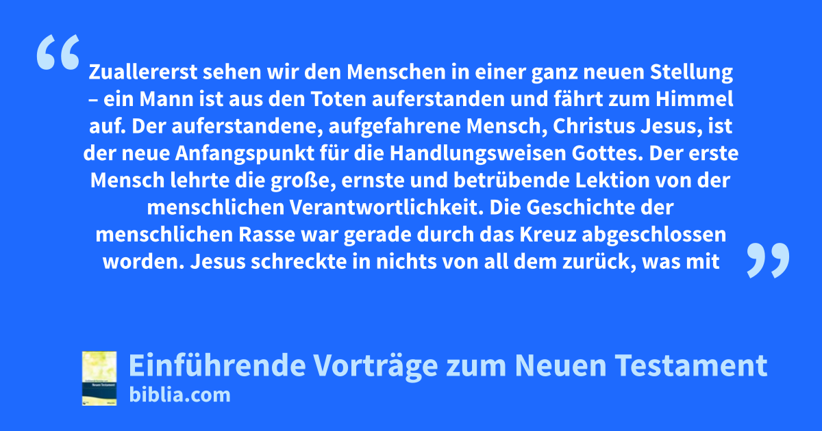 Zuallererst sehen wir den Menschen in einer ganz neuen Stellung – ein Mann ist aus den Toten auferstanden und fährt zum Himmel auf. Der auferstandene, aufgefahrene Mensch, Christus Jesus, ist der neue Anfangspunkt für die Handlungsweisen Gottes. Der erste Mensch lehrte die große, ernste und betrübende Lektion von der menschlichen Verantwortlichkeit. Die Geschichte der menschlichen Rasse war gerade durch das Kreuz abgeschlossen worden. Jesus schreckte in nichts von all dem zurück, was mit der Verantwortlichkeit eines Geschöpfes hienieden in Verbindung stand. Stattdessen begegnete er dieser zur Verherrlichung Gottes. Er allein konnte alles erfüllen; Er allein löste jedes Problem, und zwar als vollkommener Mensch. Er war jedoch nicht nur ein vollkommener Mensch; Er war auch Gott. Während seines ganzen Lebens verherrlichte Er den Vater und in seinem Tod Gott als Gott. Die Verherrlichung Gottes bestand nicht allein darin, dass Er den Menschen auf die Probe stellte, sondern auch dass Gott Wurzel und Frucht der Sünde vor seinem eigenen Angesicht entfernte. In der Kreuzigung des Herrn Jesus wurde allem, was Gott hemmte und verunehrte, für immer begegnet. Gott wurde in einer unendlich größeren und erhabeneren Weise verherrlicht, als wenn es niemals Sünde gegeben hätte. Darin liegt die wunderbare Besonderheit des Todes unseres Herrn Jesus.