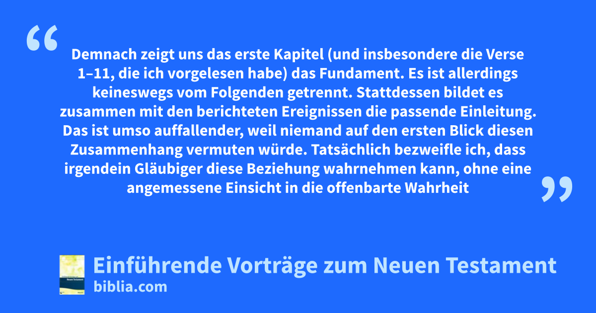 Demnach zeigt uns das erste Kapitel (und insbesondere die Verse 1–11, die ich vorgelesen habe) das Fundament. Es ist allerdings keineswegs vom Folgenden getrennt. Stattdessen bildet es zusammen mit den berichteten Ereignissen die passende Einleitung. Das ist umso auffallender, weil niemand auf den ersten Blick diesen Zusammenhang vermuten würde. Tatsächlich bezweifle ich, dass irgendein Gläubiger diese Beziehung wahrnehmen kann, ohne eine angemessene Einsicht in die offenbarte Wahrheit Gottes. Ich meine damit nicht jene Wahrheit, die einen Menschen, wenn er sie annimmt, zu einem Gläubigen macht. Es geht um die unendlich große Wahrheit, welche der Heilige Geist in diesem Buch sowie auch im ganzen Neuen Testament herausstellen möchte. Beim ersten Blick mögen manche Leser eine Schwierigkeit darin sehen, dass der Geist Gottes noch einmal am Anfang der Apostelgeschichte von der Auferstehung und Himmelfahrt Jesu berichtet, nachdem Er sie doch schon im Lukasevangelium geschildert hat. Falls wir solche Fragen haben, dann sollten wir wenigstens eins lernen, nämlich dass es weise und gut – ja, die einzige gesunde Weisheit für uns – und zum Wohlgefallen unseres Gottes ist, wenn wir als festen Grundsatz aufstellen: Gott ist immer im Recht! Sein Wort sagt niemals etwas ohne Absicht. Wenn Er manches scheinbar wiederholt, so geschieht es keinesfalls in der unsicheren Art der Menschen, sondern mit einem göttlichen Zweck. Auferstehung und auch Himmelfahrt waren notwendig, um das Bild der Wahrheit im Lukasevangelium vollkommen zu machen. Doch genauso musste derselbe Schreiber unbedingt noch einmal von dem auferstandenen und aufgefahrenen Menschen berichten als den Anfangspunkt für jene neue Entfaltung der Gnade und Wege Gottes im Menschen, die er in seinem zweiten Buch schildern sollte.