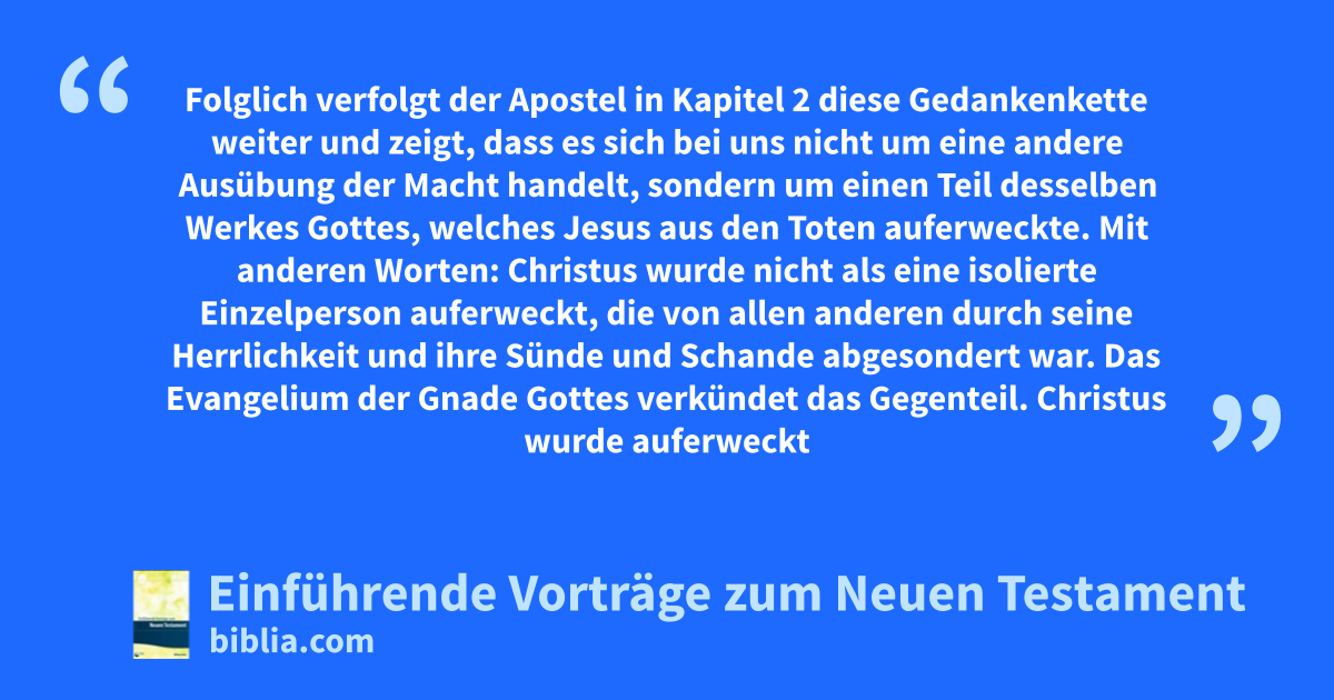 Folglich verfolgt der Apostel in Kapitel 2 diese Gedankenkette weiter und zeigt, dass es sich bei uns nicht um eine andere Ausübung der Macht handelt, sondern um einen Teil desselben Werkes Gottes, welches Jesus aus den Toten auferweckte. Mit anderen Worten: Christus wurde nicht als eine isolierte Einzelperson auferweckt, die von allen anderen durch seine Herrlichkeit und ihre Sünde und Schande abgesondert war. Das Evangelium der Gnade Gottes verkündet das Gegenteil. Christus wurde auferweckt als die große Kundgebung der göttlichen Macht, um Gottes Ratschlüsse sowie auch die Erlösung zu bewirken. Christi Auferweckung war nicht die einzige Darstellung der Offenbarung seiner Macht, sondern auch das, was Gott in Hinsicht auf uns herausstellt, geschah kraft der Entfaltung dieser göttlichen Energie. Unser Teil war sozusagen sittlich in jene Kraft eingeschlossen, die Christus von den Toten auferweckte. Das ist offensichtlich von höchstmöglichem Interesse für die Erlösten. Überall in diesem Brief besteht das Geheimnis darin, dass Gott uns mit Christus vereinigen wollte (das heißt natürlich: in all dem, was mit der Bewahrung der göttlichen Herrlichkeit übereinstimmt). Was immer dazu beitragen kann, was immer damit übereinstimmt und alles was Gott tun kann, um uns mit Christus zu verbinden, indem Er uns teilhaben lässt an allem, was in Christus, seinem eigenen Sohn, herrlich ist bis hin zu seiner heiligen Natur und seinen Beziehungen zum Vater (soweit sie auf ein Geschöpf übertragen werden können) – all das hatte Gott in seinem Herzen für uns. Ja, Gott hat es uns jetzt schon gegeben und wird es in Kürze in den himmlischen Örtern in Vollkommenheit enthüllen.