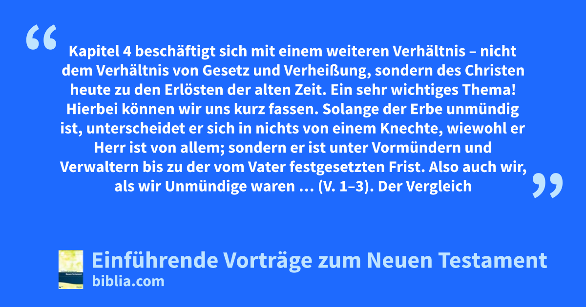 Kapitel 4 beschäftigt sich mit einem weiteren Verhältnis – nicht dem Verhältnis von Gesetz und Verheißung, sondern des Christen heute zu den Erlösten der alten Zeit. Ein sehr wichtiges Thema! Hierbei können wir uns kurz fassen. Solange der Erbe unmündig ist, unterscheidet er sich in nichts von einem Knechte, wiewohl er Herr ist von allem; sondern er ist unter Vormündern und Verwaltern bis zu der vom Vater festgesetzten Frist. Also auch wir, als wir Unmündige waren … (V. 1–3). Der Vergleich umfasst die alttestamentlichen Gläubigen; aber der Ausdruck (also auch wir) galt ebenso für die damals Lebenden, welche sich in diesem Zustand befanden. Als wir Unmündige waren, waren wir geknechtet unter die Elemente der Welt; als aber die Fülle der Zeit gekommen war, sandte Gott seinen Sohn, geboren von einem Weibe, geboren unter Gesetz, auf daß er die, welche unter Gesetz waren, loskaufte, auf daß wir die Sohnschaft empfingen. Der Apostel zeigt, dass Gott weit davon entfernt ist, die Christen zu nehmen und auf den Boden des Alten Testaments zu stellen. Stattdessen leitet Er in Wirklichkeit jene, die in Verbindung zum Alten standen, durch die Erlösung von diesem weg. Paulus bestätigt durchaus, dass der Herr sowohl von einer Frau als auch unter dem Gesetz geboren wurde. Aber welches endgültige Ziel stand vor den Blicken? Die Menschen sollten nicht unter dem Gesetz festgehalten, noch weniger andere unter dasselbe gestellt werden. Im Gegenteil ging es darum, solche zu befreien, die vorher unter demselben standen. Das galt für die Gläubigen des Alten Testaments und viele jüdische Gläubige, die damals lebten. War es dann möglich, dass irgendjemand das Verlangen haben konnte, die Nichtjuden unter das Gesetz zu stellen, da doch die Juden selbst nach dem Willen Gottes durch das Werk Christi und entsprechend dem Zeugnis des Heiligen Geistes aus demselben herausgeführt worden sind? Welch ein Widerspruch! Was für ein Umsturz – nicht nur der Wahrheit Gottes, wie sie im Evangelium offenbart wurde, sondern auch der Erlösung, die dessen Grundlage ist! Denn Christus hat solche, die unter Gesetz waren, losgekauft, damit wir die Sohnschaft empfingen. Er führte aus jener Knechtschaft und Unmündigkeit, die das Gesetz voraussetzte, durch die Gnade in eine Stellung bewussten Heils und verständnisvoller Freude in Verbindung mit unserem Gott und Vater.