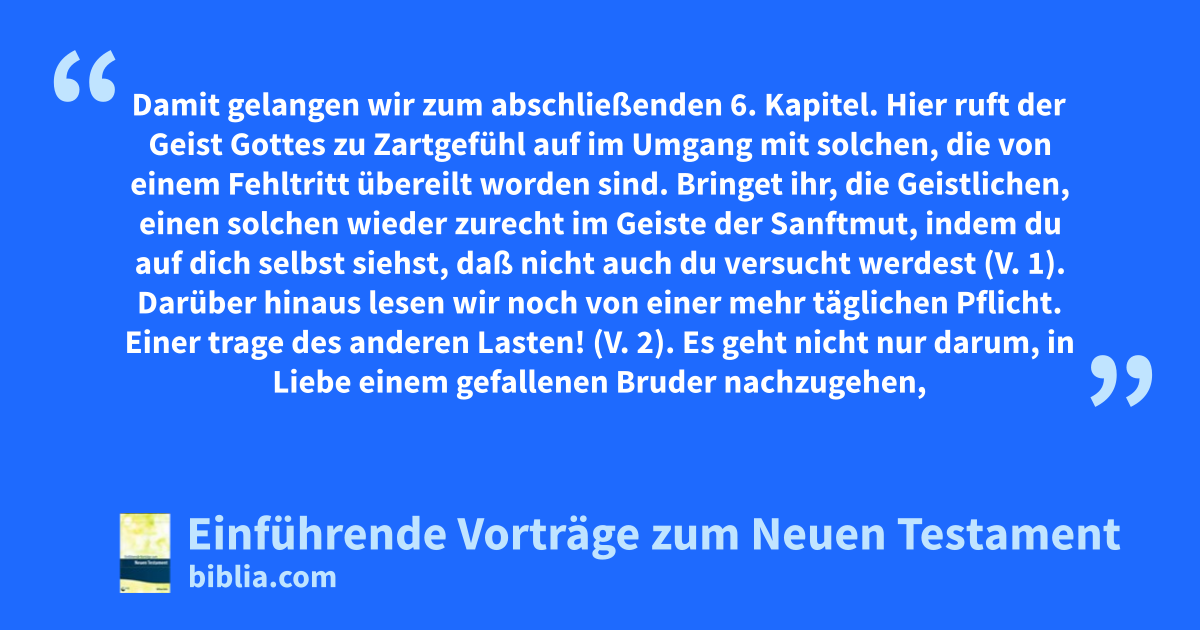 Hier ruft der Geist Gottes zu Zartgefühl auf im Umgang mit solchen, die von einem Fehltritt übereilt worden sind. Bringet ihr, die Geistlichen, einen solchen wieder zurecht im Geiste der Sanftmut, indem du auf dich selbst siehst, daß nicht auch du versucht werdest (V. 1). Darüber hinaus lesen wir noch von einer mehr täglichen Pflicht. Einer trage des anderen Lasten! (V. 2). Es geht nicht nur darum, in Liebe einem gefallenen Bruder nachzugehen, sondern auch anderen gegenüber ein Beistand in ihren Schwierigkeiten zu sein. Die Liebe findet ihr Wirkungsfeld in der Sorge für solche, die niedergeworfen sind – und also erfüllet das Gesetz des Christus! Möchtest du ein Gesetz haben? Ist dieses nicht gerade das richtige Gesetz für dich? Es ist das Gesetz Christi. So lebte und bewegte Er sich hier auf der Erde. Das Gesetz Moses fordert einen Menschen auf, an seinem Platz seine Pflicht zu tun. Das Gesetz Christi macht sozusagen das Hinausgehen in Liebe zu anderen zur Freude eines Erlösten. Genauso handelte Christus auf der Erde; und die höchste Berufung für einen Christen besteht darin, eine Darstellung Christi zu sein.