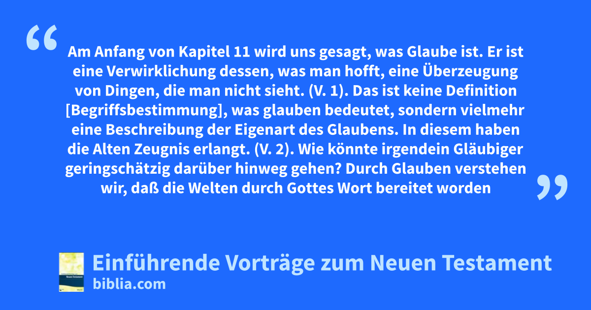 Durch Glauben verstehen wir, daß die Welten durch Gottes Wort bereitet worden sind. Es ist möglich, daß das Wort Welten, welches ein hebraistisches Wort und insbesondere für die alexandrinischen Juden12 kennzeichnend ist, auch den Begriff Haushaltungen umfaßt. Doch zweifellos ist auch die materielle Welt eingeschlossen. Vielleicht bedeutet es: Die Welten, wie sie von den Haushaltungen regiert werden. Ein sachkundiger Geist kann jedenfalls kaum bestreiten, daß der Begriff das ganze Universum einschließt. Die Welten (Sind) durch Gottes Wort bereitet worden, sodaß das, was man sieht [dieses träfe nicht zu, wenn es sich nur um Haushaltungen handeln würde], nicht aus Erscheinendem geworden ist.