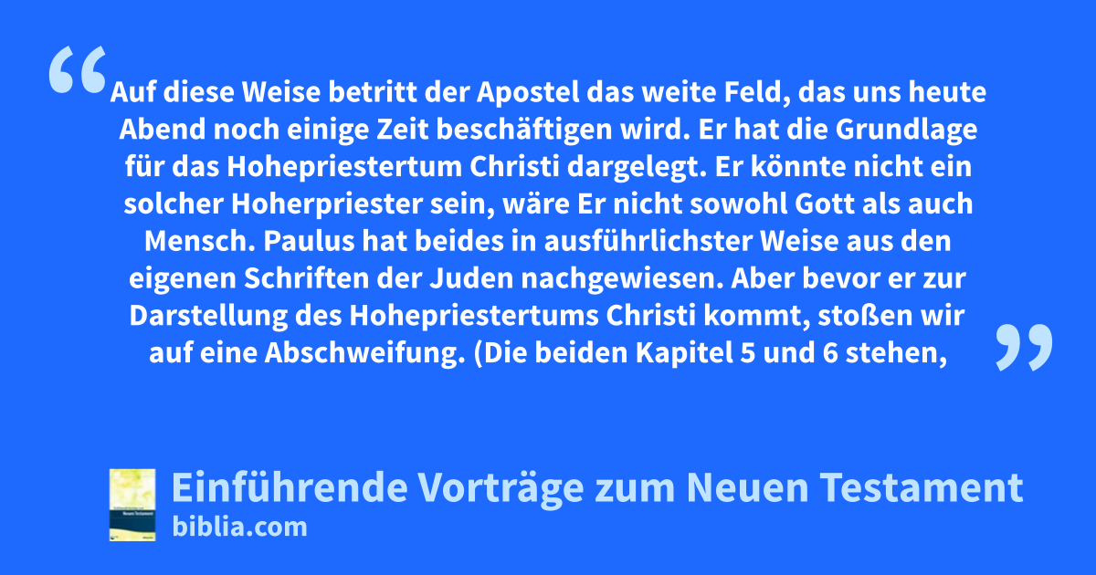 Aber bevor er zur Darstellung des Hohepriestertums Christi kommt, stoßen wir auf eine Abschweifung. (Die beiden Kapitel 5 und 6 stehen, wie ich meine, mit den beiden schon betrachteten in Verbindung.). Dennoch antwortet der Gedanke Christus … als Sohn über sein Haus sehr gut auf das erste Kapitel, so wie das zweite Kapitel bald in der Ruhe Gottes seine Erfüllung finden wird. Ich hoffe nämlich, beweisen zu können, daß letzteres auf dem Schauplatz der zukünftigen Herrlichkeit geschieht. Wo jemand so tiefgründig schreibt wie der Apostel, begrüßt der Leser im allgemeinen die geringste Hilfe, um die Struktur eines Briefes verstehen zu können. Möge der Leser dieses bedenken!