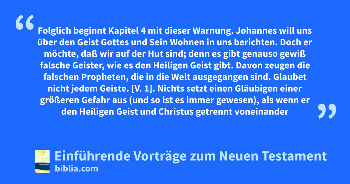 Wie es auch immer sein mag – hier warnt der Apostel die Erlösten ernst vor falschen Propheten. Viele solche Menschen waren in die Welt hinausgegangen. Wir benötigen folglich einige sichere Mittel, um sie zu erkennen. Es geht nicht um die Entscheidung, wer Christus angehört und wer nicht, sondern vielmehr darum, welche Art Geist durch diesen oder jenen Lehrer wirkt. Der Gesichtspunkt ist hier keinesfalls, den Zustand eines Menschen vor Gott oder sein ewiges Schicksal zu verkündigen. Die Menschen sind ständig geneigt, dort eine Meinung zu bilden und auszusprechen, wo der Herr es verbietet. Es ist klar, daß der Herr uns dazu aufruft, freimütig Personen als aus Gott geboren anzunehmen, wenn sie ein wahres Zeugnis von Christus ablegen. Auf der anderen Seite sollten wir uns hüten, jene zu unterstützen, deren Zeugnis in Wort oder Tat gegen den Namen Jesu gerichtet ist.