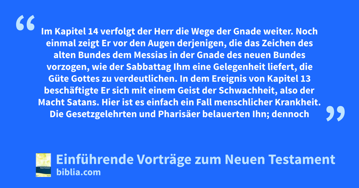 Im Kapitel 14 verfolgt der Herr die Wege der Gnade weiter. Noch einmal zeigt Er vor den Augen derjenigen, die das Zeichen des alten Bundes dem Messias in der Gnade des neuen Bundes vorzogen, wie der Sabbattag Ihm eine Gelegenheit liefert, die Güte Gottes zu verdeutlichen. In dem Ereignis von Kapitel 13 beschäftigte Er sich mit einem Geist der Schwachheit, also der Macht Satans. Hier ist es einfach ein Fall menschlicher Krankheit. Die Gesetzgelehrten und Pharisäer belauerten Ihn; dennoch stellte Jesus seine Frage öffentlich. Als sie schwiegen, fasste Er den Wassersüchtigen an, heilte ihn und ließ ihn gehen. Danach beantwortete Er ihre Gedanken mit einem unwiderstehlichen Appell an ihre eigene Handlungsweise und ihr Gewissen. Selbst der Mensch sucht dem, was ihm gehört, Gutes zu tun. Daher ist er nicht befugt, Gottes Recht zu bestreiten, wenn Er in Liebe mit den elenden Gegenständen, die Er in seiner Herablassung sein Eigen nennt, handelt.