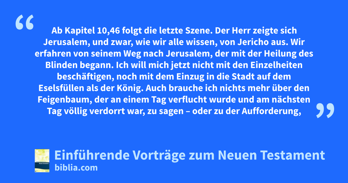 Ab Kapitel 10,46 folgt die letzte Szene. Der Herr zeigte sich Jerusalem, und zwar, wie wir alle wissen, von Jericho aus. Wir erfahren von seinem Weg nach Jerusalem, der mit der Heilung des Blinden begann. Ich will mich jetzt nicht mit den Einzelheiten beschäftigen, noch mit dem Einzug in die Stadt auf dem Eselsfüllen als der König. Auch brauche ich nichts mehr über den Feigenbaum, der an einem Tag verflucht wurde und am nächsten Tag völlig verdorrt war, zu sagen – oder zu der Aufforderung, dass wir Gott glauben sollen, und zu den Auswirkungen, die der Glaube auf das Gebet ausübt. Ebenso wenig müssen wir noch besonders auf die Frage der Autorität, welche die religiösen Führer stellten, eingehen.7