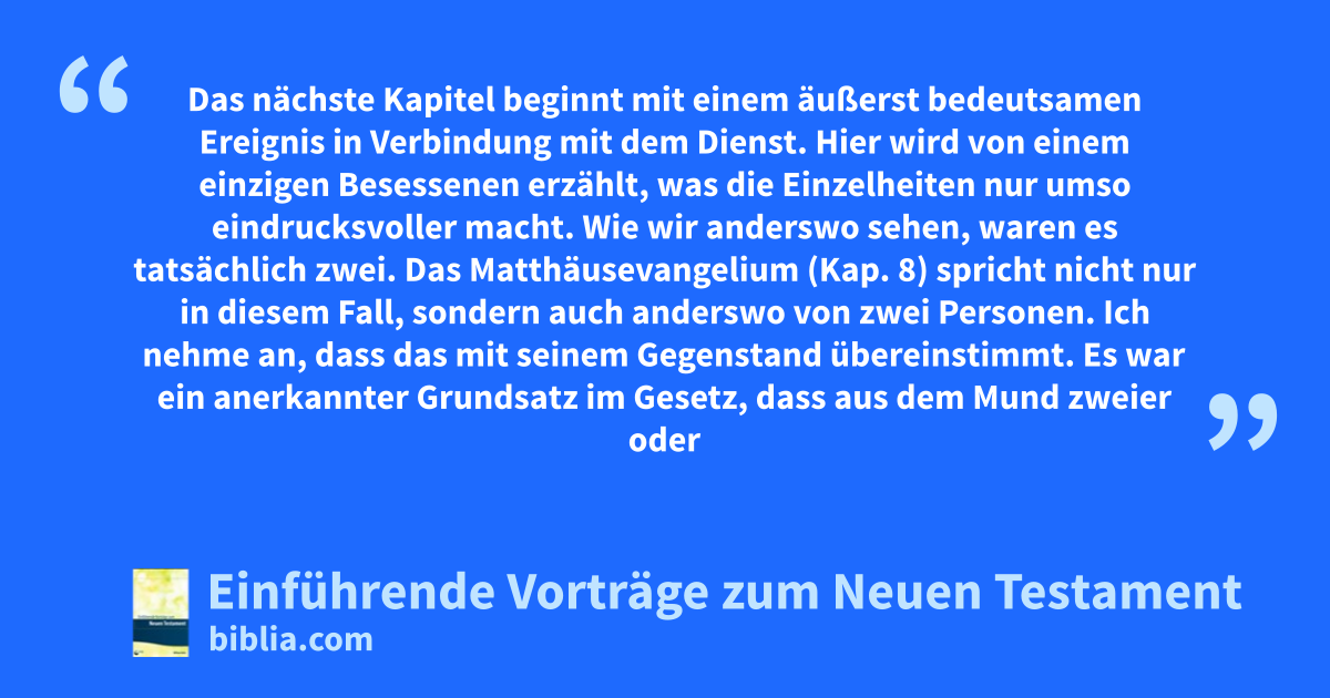 Das nächste Kapitel beginnt mit einem äußerst bedeutsamen Ereignis in Verbindung mit dem Dienst. Hier wird von einem einzigen Besessenen erzählt, was die Einzelheiten nur umso eindrucksvoller macht. Wie wir anderswo sehen, waren es tatsächlich zwei. Das Matthäusevangelium (Kap. 8) spricht nicht nur in diesem Fall, sondern auch anderswo von zwei Personen. Ich nehme an, dass das mit seinem Gegenstand übereinstimmt. Es war ein anerkannter Grundsatz im Gesetz, dass aus dem Mund zweier oder dreier Zeugen jede Sache bestätigt werden sollte (z. B. 5. Mo 17,6). Und derjenige unter den Evangelisten, der sozusagen mit der Botschaft an die Beschneidung bekleidet war und mit Bezug auf die Beschneidung sprach, gibt das erforderliche Zeugnis zur Orientierung derer in Israel, die Ohren hatten zu hören. Nichts dieser Art stand vor Markus. Er schrieb nicht, um insbesondere jüdischen Heiligen und jüdischen Schwierigkeiten zu begegnen, sondern vielmehr für andere Menschen, die nicht so eingegrenzt waren. Stattdessen muss er ihnen von Zeit zu Zeit jüdische Besonderheiten erklären. Er hat offensichtlich die ganze Menschheit so weit wie die Welt im Blickfeld und stellt, wie wir wohl zu Recht annehmen dürfen, den bemerkenswerteren der beiden Besessenen heraus. Auch sollen hier nicht die Schicksale Israels in den letzten Tagen geschildert werden. Ich leugne allerdings nicht, dass wir hier eine symbolische Anspielung auf das finden, was bei Matthäus völlig herausgestellt wird. Aber ich nehme an, dass das besondere Thema dieses Kapitels darin besteht, die sittlichen Wirkungen des Dienstes Christi, die hier mit Macht vor die Seele gestellt werden, zu verfolgen. Wir haben deshalb den schlimmstmöglichen Fall vor uns. Es handelte sich weder um einen Aussätzigen noch um einen Gelähmten, ja, noch nicht einmal einfach um einen Mann mit einem unreinen Geist. Es ist die sorgfältige Beschreibung eines Falles, der entsetzlicher ist als jeder andere, den wir sonst wo in den Evangelien finden. Und niemand beschreibt ihn mit solcher Kraft und eindringlicher Natürlichkeit oder, anders ausgedrückt, so ausführlich wie unser Evangelist.