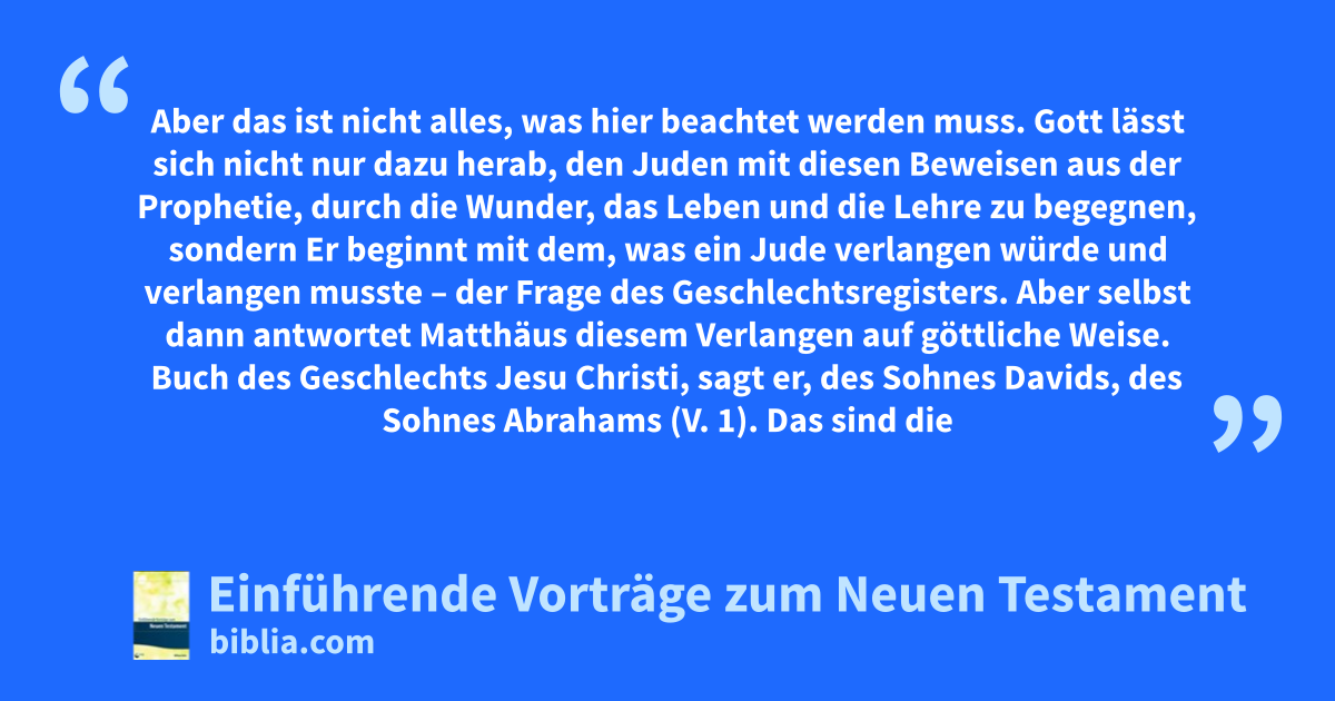 Aber das ist nicht alles, was hier beachtet werden muss. Gott lässt sich nicht nur dazu herab, den Juden mit diesen Beweisen aus der Prophetie, durch die Wunder, das Leben und die Lehre zu begegnen, sondern Er beginnt mit dem, was ein Jude verlangen würde und verlangen musste – der Frage des Geschlechtsregisters. Aber selbst dann antwortet Matthäus diesem Verlangen auf göttliche Weise. Buch des Geschlechts Jesu Christi, sagt er, des Sohnes Davids, des Sohnes Abrahams (V. 1). Das sind die beiden grundsätzlichen Fixpunkte, zu denen ein Jude sich wendet – auf der einen Seite das durch die Gnade Gottes geschenkte Königtum, auf der anderen Seite der Besitzer der Verheißungen Gottes.