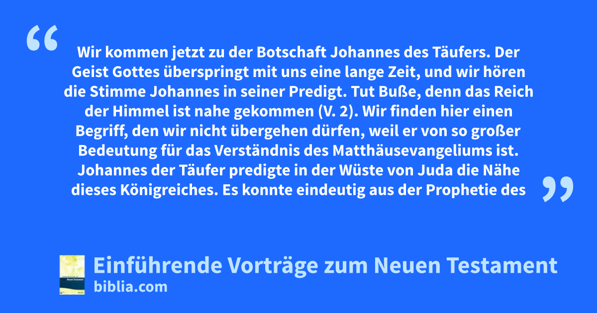 Wir kommen jetzt zu der Botschaft Johannes des Täufers. Der Geist Gottes überspringt mit uns eine lange Zeit, und wir hören die Stimme Johannes in seiner Predigt. Tut Buße, denn das Reich der Himmel ist nahe gekommen (V. 2). Wir finden hier einen Begriff, den wir nicht übergehen dürfen, weil er von so großer Bedeutung für das Verständnis des Matthäusevangeliums ist. Johannes der Täufer predigte in der Wüste von Juda die Nähe dieses Königreiches. Es konnte eindeutig aus der Prophetie des Alten Testamentes, insbesondere derjenigen Daniels, entnommen werden, dass der Gott des Himmels ein Königreich aufrichten würde. Und dieses Königreich sollte vom Sohn des Menschen verwaltet werden. Und ihm wurde Herrschaft und Herrlichkeit und Königtum gegeben, und alle Völker, Völkerschaften und Sprachen dienten ihm; seine Herrschaft ist eine ewige Herrschaft, die nicht vergehen wird, und sein Königtum ein solches, das nie zerstört werden wird (Dan 7,14). Das war also das Reich der Himmel. Es war nicht bloß ein Königreich auf der Erde; es bestand auch nicht im Himmel; es war der Himmel, wie er für immer über die Erde herrscht.