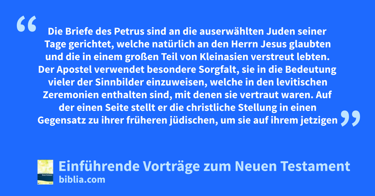 Die Briefe des Petrus sind an die auserwählten Juden seiner Tage gerichtet, welche natürlich an den Herrn Jesus glaubten und die in einem großen Teil von Kleinasien verstreut lebten. Der Apostel verwendet besondere Sorgfalt, sie in die Bedeutung vieler der Sinnbilder einzuweisen, welche in den levitischen Zeremonien enthalten sind, mit denen sie vertraut waren. Auf der einen Seite stellt er die christliche Stellung in einen Gegensatz zu ihrer früheren jüdischen, um sie auf ihrem jetzigen Platz und in ihrer Berufung in und durch Christus zu stärken. Auf der anderen achtet er sorgsam darauf, jede gemeinsame Wahrheit zwischen den Christen und den Erlösten des Alten Testaments völlig anzuerkennen. Denn es ist wohl kaum notwendig, einen verständigen Gläubigen darauf hinzuweisen – wie immer die neuen Vorrechte und folglich auch die neuen Verpflichtungen sind, die aus jenen Vorrechten hervorgehen –, daß es gewisse unwandelbare sittliche Grundsätze gibt, welche Gott in allen Zeitaltern festhält. Darauf bestand Gott im Alten Testament – vor allem in den Psalmen und in den Prophetenbüchern; und der Apostel warnt vor der falschen Schlußfolgerung, daß es keine gemeinsamen Grundlagen gibt, nachdem wir in gewissen Beziehungen in einem Gegensatz zu den alt-testamentlichen Gläubigen stehen.