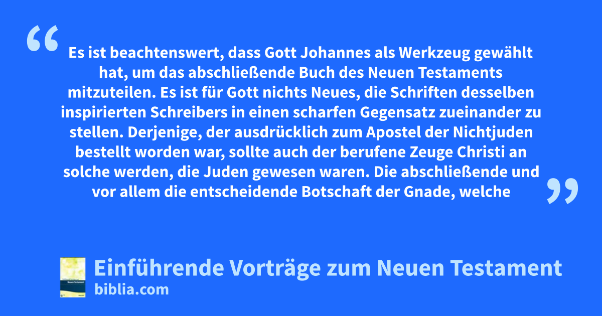 Es ist beachtenswert, dass Gott Johannes als Werkzeug gewählt hat, um das abschließende Buch des Neuen Testaments mitzuteilen. Es ist für Gott nichts Neues, die Schriften desselben inspirierten Schreibers in einen scharfen Gegensatz zueinander zu stellen. Derjenige, der ausdrücklich zum Apostel der Nichtjuden bestellt worden war, sollte auch der berufene Zeuge Christi an solche werden, die Juden gewesen waren. Die abschließende und vor allem die entscheidende Botschaft der Gnade, welche die Juden aus jeder irdischen Verbindung heraus zu Christus im Himmel rief, wurde weder Petrus noch Jakobus gegeben, sondern Paulus. So wurde auch der Zeuge von Gnade und Wahrheit, die durch Jesus Christus gekommen sind, nach Gottes Gedanken (und nicht der Menschen) der geeignetste Mittler, die zukünftigen Gerichte Gottes zu offenbaren. Tatsächlich liegt der sittliche Grund darin: Christus wird zum Vollzieher des Gerichts, nachdem Er als Gegenstand des Glaubens und einziger Kanal der Gnade verworfen wurde. Das wird uns förmlich und lehrmäßig in Johannes 5 dargestellt. Nun wurden jene Gnade und Wahrheit genauso wie früher Christus selbst durch jenes Gebilde vollkommen verachtet, das seinen Namen auf der Erde trug. Darum war Johannes mehr als jeder andere geeignet, die ernsten Gerichte in Visionen von seiten Gottes zu zeigen, durch welche Er die geringschätzig behandelten Rechte seines Sohnes rächt. Das geschieht zunächst durch Gerichtshandlungen in der Vorsehung, zuletzt durch Christus Selbst, der kommen wird, um persönlich das Gericht auszuüben.