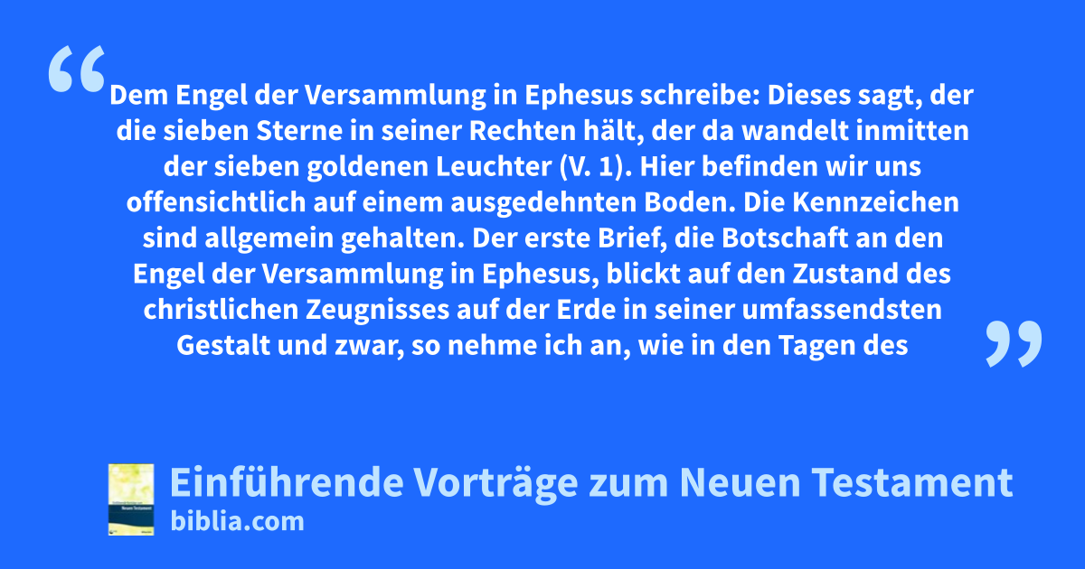 Dem Engel der Versammlung in Ephesus schreibe: Dieses sagt, der die sieben Sterne in seiner Rechten hält, der da wandelt inmitten der sieben goldenen Leuchter (V. 1). Hier befinden wir uns offensichtlich auf einem ausgedehnten Boden. Die Kennzeichen sind allgemein gehalten. Der erste Brief, die Botschaft an den Engel der Versammlung in Ephesus, blickt auf den Zustand des christlichen Zeugnisses auf der Erde in seiner umfassendsten Gestalt und zwar, so nehme ich an, wie in den Tagen des Apostel Johannes selbst. Der Herr stellt sich folglich in einer ähnlichen Weitläufigkeit vor. Der die sieben Sterne in seiner Rechten hält. Das ist seine Stellung, wie Er sie dem Dienst und der Versammlung gegenüber einnimmt – sein Verhältnis zu den Engeln, d. h. denjenigen, die sittlich die Versammlungen vor seinem Auge vertreten, sowie auch zu den Versammlungen selbst. Der Stern ist jener Gegenstand, der auf die Versammlung einwirkt. Bekanntermaßen handelt es sich um den Träger des Lichts von Seiten des Herrn, das sich mit dem Zustand der Erlösten Gottes beschäftigt. Wenn dieses Licht unwirksam ist – wenn es sich mit Bösem mischt –, ist auch der Zustand einer Versammlung davon betroffen. Ist es strahlend, wird eine Versammlung dadurch sittlich erhöht. Das ist, denke ich, hier gemeint. So erkennen wir in Ihm, der sie alle in seiner Rechten hält und inmitten der goldenen Leuchter wandelt, Christus nicht allein als Denjenigen, der solche ideellen Repräsentanten festhält, sondern auch als Den, der an den Versammlungen selbst Anteil nimmt. Kurz gesagt, handelt es sich um Christus unter seinem umfassendsten, den Dienst und die Versammlung betreffenden Gesichtspunkt – natürlich entsprechend dem Charakter dieses Buches.