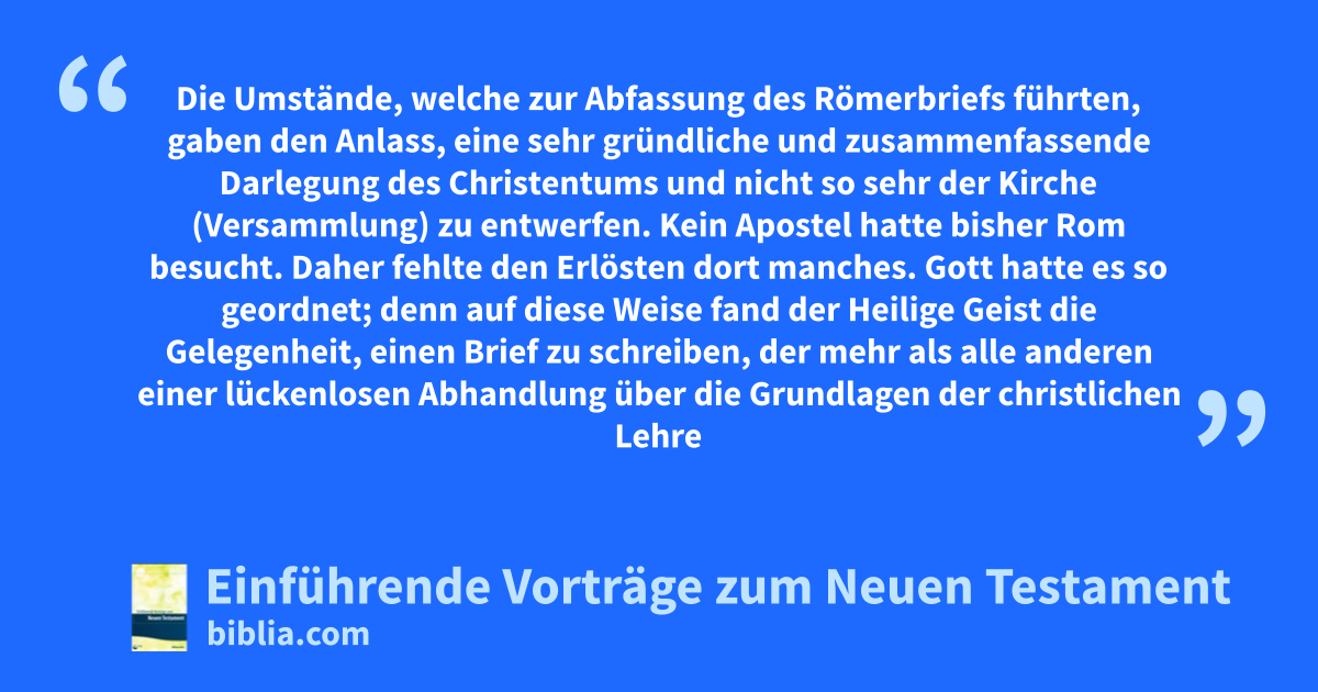 Die Umstände, welche zur Abfassung des Römerbriefs führten, gaben den Anlass, eine sehr gründliche und zusammenfassende Darlegung des Christentums und nicht so sehr der Kirche (Versammlung) zu entwerfen. Kein Apostel hatte bisher Rom besucht. Daher fehlte den Erlösten dort manches. Gott hatte es so geordnet; denn auf diese Weise fand der Heilige Geist die Gelegenheit, einen Brief zu schreiben, der mehr als alle anderen einer lückenlosen Abhandlung über die Grundlagen der christlichen Lehre und ganz besonders ihrer Gerechtigkeit nahekommt.
