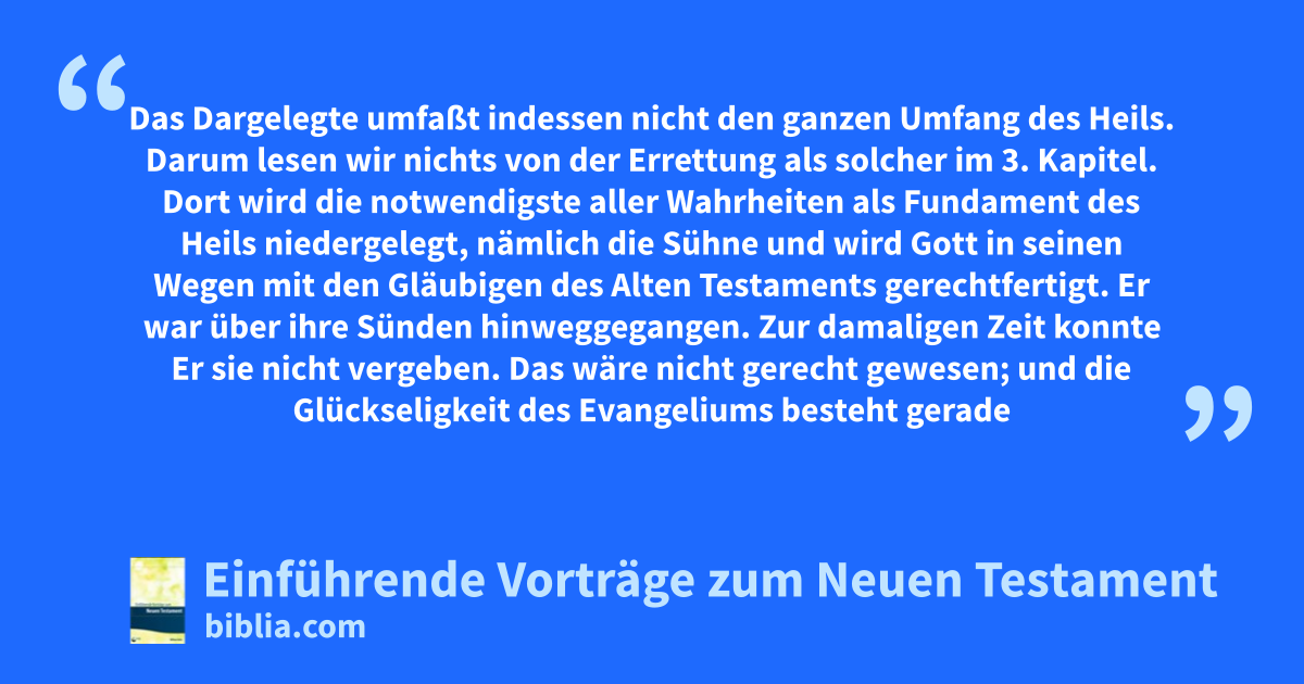 Das Dargelegte umfaßt indessen nicht den ganzen Umfang des Heils. Darum lesen wir nichts von der Errettung als solcher im 3. Kapitel. Dort wird die notwendigste aller Wahrheiten als Fundament des Heils niedergelegt, nämlich die Sühne und wird Gott in seinen Wegen mit den Gläubigen des Alten Testaments gerechtfertigt. Er war über ihre Sünden hinweggegangen. Zur damaligen Zeit konnte Er sie nicht vergeben. Das wäre nicht gerecht gewesen; und die Glückseligkeit des Evangeliums besteht gerade darin, dass letzteres nicht allein ein Ausdruck der Barmherzigkeit, sondern vor allem der göttlichen Gerechtigkeit ist. Es wäre nicht gerecht in irgendeinem Sinn gewesen, die Sünden zu vergeben, bevor sie nicht wirklich von jemand getragen worden waren, der für sie leiden konnte und gelitten hat. Das ist jedoch inzwischen geschehen; und auf diese Weise hat Gott sich vollkommen hinsichtlich der Vergangenheit gerechtfertigt. Aber dieses große Werk Christi konnte sich nicht einfach auf die Rechtfertigung Gottes beschränken. Andere Gesichtspunkte finden wir auf unterschiedliche Weise in verschiedenen Teilen der Heiligen Schrift dargestellt, wie ich im Vorbeigehen erwähnen möchte, um damit zu zeigen, welchen Punkt wir nun erreicht haben. Gottes Gerechtigkeit hinsichtlich der Sünden in der Vergangenheit ist jetzt offenbar geworden, welche Er wegen seines Hingehenlassens damals nicht ins Gericht gebracht hat; und wir erkennen seine Gerechtigkeit noch auffallender in der gegenwärtigen Zeit, wenn Er dieselbe in der Rechtfertigung des Glaubenden offenbart.