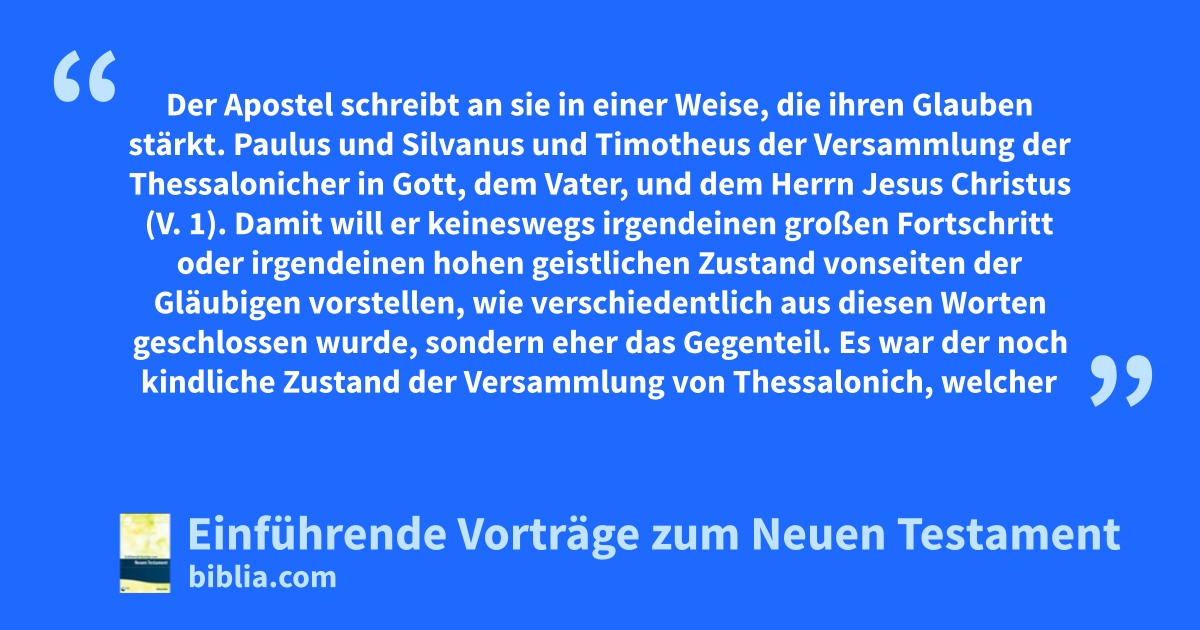 Der Apostel schreibt an sie in einer Weise, die ihren Glauben stärkt. Paulus und Silvanus und Timotheus der Versammlung der Thessalonicher in Gott, dem Vater, und dem Herrn Jesus Christus (V. 1). Damit will er keineswegs irgendeinen großen Fortschritt oder irgendeinen hohen geistlichen Zustand vonseiten der Gläubigen vorstellen, wie verschiedentlich aus diesen Worten geschlossen wurde, sondern eher das Gegenteil. Es war der noch kindliche Zustand der Versammlung von Thessalonich, welcher anscheinend diese Art der Anrede durch den Apostel veranlasste. So wie ein Säugling in einer Familie ein besonderer Gegenstand der Anteilnahme für einen Vater ist – insbesondere wenn ihn Gefahr umgibt –, so ermuntert der Apostel die Kirche der Thessalonicher, indem er davon spricht, dass sie in Gott dem Vater und dem Herrn Jesus Christus sind (vgl. Joh 10,28–29!). Sie werden als Kinder gesehen, und zwar nicht in dem Sinn, dass sie als Wiedergeborene Gottes Kinder sind, sondern als Kleinkinder. So betrachtet der Heilige Geist die Versammlung der Thessalonicher. Als Beweis für die Richtigkeit unserer Anschauung sei angemerkt, dass zu jener Zeit offensichtlich in ihrer Mitte noch keine ordnungsgemäße Aufsicht bestanden hat. Wir lesen keinen Hinweis auf eingesetzte Älteste, genauso wenig wie bei den Korinthern. Sie zeigten nicht wenig Kraft; gleichzeitig trug diese Versammlung noch den Stempel der Jugend. Der frische Strom der Zuneigung füllte ihre Herzen; und der Glanz der Wahrheit war sozusagen gerade erst über ihren Seelen aufgegangen. Dieses und einiges mehr von gleicher Art kann leicht aufgespürt werden. Außerdem finden wir hier eine anschauliche Lektion, wie mit dem Eingang von Irrtum und der Gefahr, welche die Kinder Gottes bedroht, umgegangen werden sollte, vor allem unter solchen Erlösten, die im gemeinsamen Glauben noch recht unausgeprägt sind.