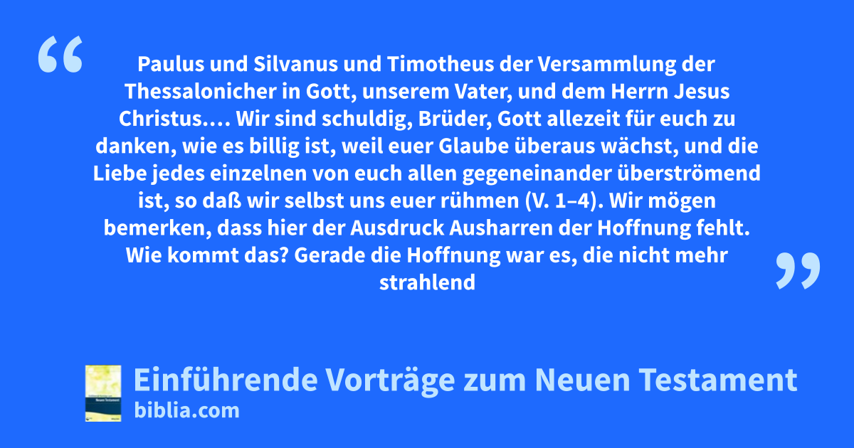 Paulus und Silvanus und Timotheus der Versammlung der Thessalonicher in Gott, unserem Vater, und dem Herrn Jesus Christus.… Wir sind schuldig, Brüder, Gott allezeit für euch zu danken, wie es billig ist, weil euer Glaube überaus wächst, und die Liebe jedes einzelnen von euch allen gegeneinander überströmend ist, so daß wir selbst uns euer rühmen (V. 1–4). Wir mögen bemerken, dass hier der Ausdruck Ausharren der Hoffnung fehlt. Wie kommt das? Gerade die Hoffnung war es, die nicht mehr strahlend in ihren Herzen brannte. So weit hatte der Feind schon Erfolg gehabt. Sie waren getröstet worden, doch sie hatten etwas von dem Licht und der Freude der Hoffnung verloren. Ihre Drangsal hatte sie mehr oder weniger in Unruhe versetzt. Das geschah möglicherweise nicht so sehr durch den äußeren Druck als vielmehr durch die Einflüsterungen Satans mittels falscher Lehre, welche für ein Kind Gottes weit gefährlicher ist. Ganz offensichtlich erwähnt der Apostel nur ihren wachsenden Glauben und ihre überströmende Liebe. Er rühmt und erwähnt nicht länger ihr Ausharren der Hoffnung, sondern betet für sie in Kapitel 3 in einer Weise, bei der sich ihr Mangel in dieser Hinsicht zeigt. Das heißt: Paulus nimmt nur zwei der Kennzeichen wieder auf, die er im ersten Brief erwähnt hat, aber nicht das dritte. Letzteres, das mit dem ganzen Inhalt des ersten Briefes in Verbindung stand, wird im zweiten weggelassen. Dafür gab es nur zu guten Grund. Inzwischen hatten sie es sich, wie ich gerade erklärt habe, entwinden lassen. Es war richtig, dass der Apostel ihnen schrieb: Wir sind schuldig, Brüder, Gott allezeit für euch zu danken … wegen eures Ausharrens und Glaubens [er spricht nicht von ihrem Ausharren der Hoffnung] in allen euren Verfolgungen und Drangsalen, die ihr erduldet. Sie hielten Christus fest und gaben Ihn nicht auf. Ihre Seelen besaßen hingegen nicht mehr dieselbe Spannkraft durch Christus als ihre Hoffnung. Den Beweis dafür werden wir bald völliger erkennen.