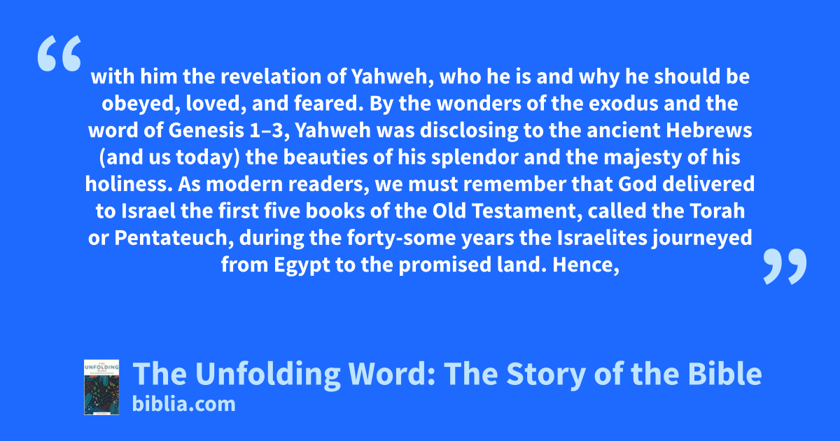 with him the revelation of Yahweh, who he is and why he should be obeyed, loved, and feared. By the wonders of the exodus and the word of Genesis 1–3, Yahweh was disclosing to the ancient Hebrews (and us today) the beauties of his splendor and the majesty of his holiness. As modern readers, we must remember that God delivered to Israel the first five books of the Old Testament, called the Torah or Pentateuch, during the forty-some years the Israelites journeyed from Egypt to the promised land. Hence,