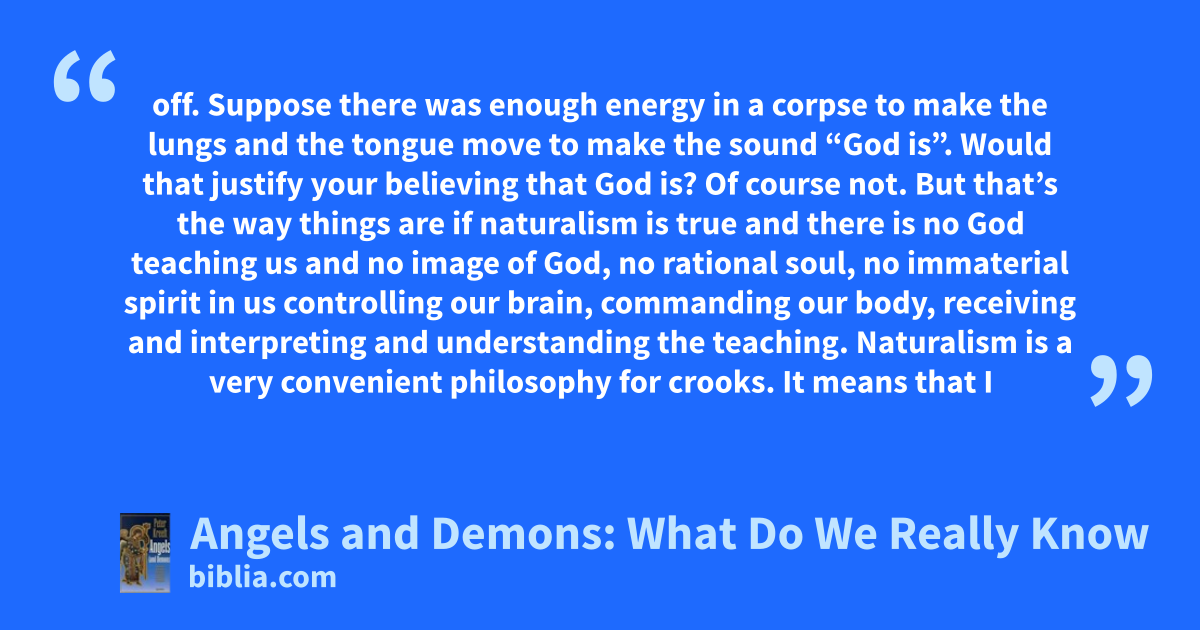 off. Suppose there was enough energy in a corpse to make the lungs and the tongue move to make the sound “God is”. Would that justify your believing that God is? Of course not. But that’s the way things are if naturalism is true and there is no God teaching us and no image of God, no rational soul, no immaterial spirit in us controlling our brain, commanding our body, receiving and interpreting and understanding the teaching. Naturalism is a very convenient philosophy for crooks. It means that I