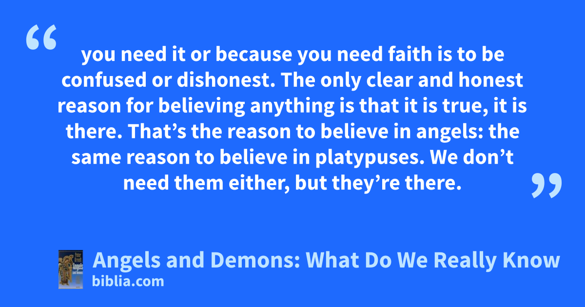 you need it or because you need faith is to be confused or dishonest. The only clear and honest reason for believing anything is that it is true, it is there. That’s the reason to believe in angels: the same reason to believe in platypuses. We don’t need them either, but they’re there.