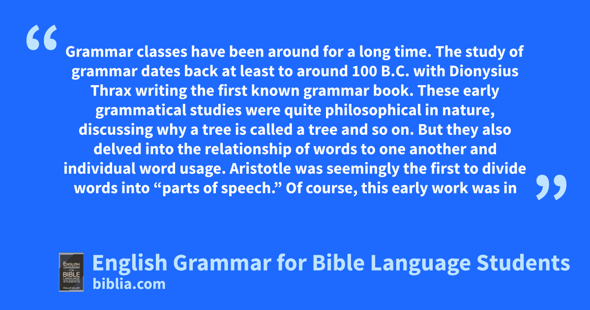 Grammar classes have been around for a long time. The study of grammar dates back at least to around 100 B.C. with Dionysius Thrax writing the first known grammar book. These early grammatical studies were quite philosophical in nature, discussing why a tree is called a tree and so on. But they also delved into the relationship of words to one another and individual word usage. Aristotle was seemingly the first to divide words into “parts of speech.” Of course, this early work was in