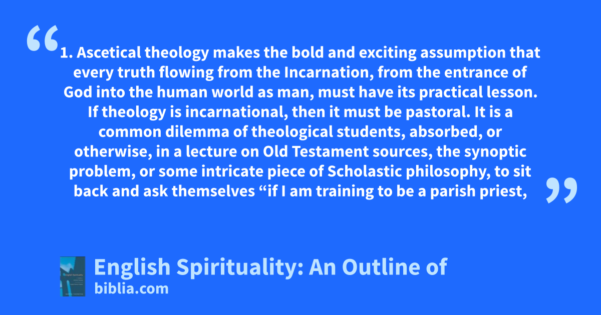 1. Ascetical theology makes the bold and exciting assumption that every truth flowing from the Incarnation, from the entrance of God into the human world as man, must have its practical lesson. If theology is incarnational, then it must be pastoral. It is a common dilemma of theological students, absorbed, or otherwise, in a lecture on Old Testament sources, the synoptic problem, or some intricate piece of Scholastic philosophy, to sit back and ask themselves “if I am training to be a parish priest,