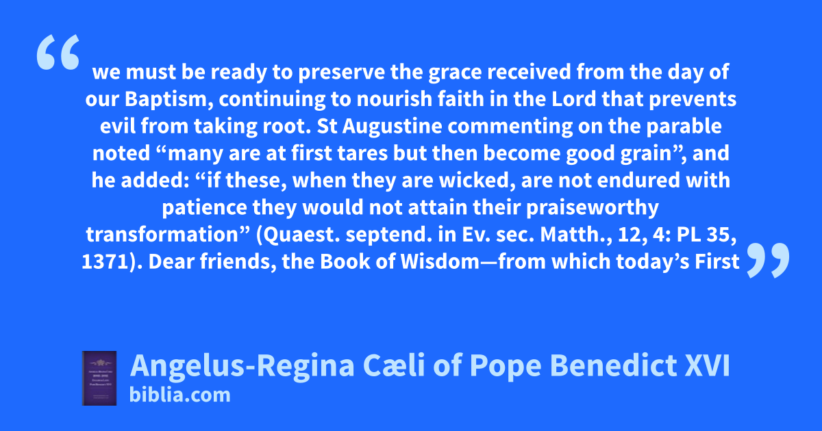 we must be ready to preserve the grace received from the day of our Baptism, continuing to nourish faith in the Lord that prevents evil from taking root. St Augustine commenting on the parable noted “many are at first tares but then become good grain”, and he added: “if these, when they are wicked, are not endured with patience they would not attain their praiseworthy transformation” (Quaest. septend. in Ev. sec. Matth., 12, 4: PL 35, 1371). Dear friends, the Book of Wisdom—from which today’s First