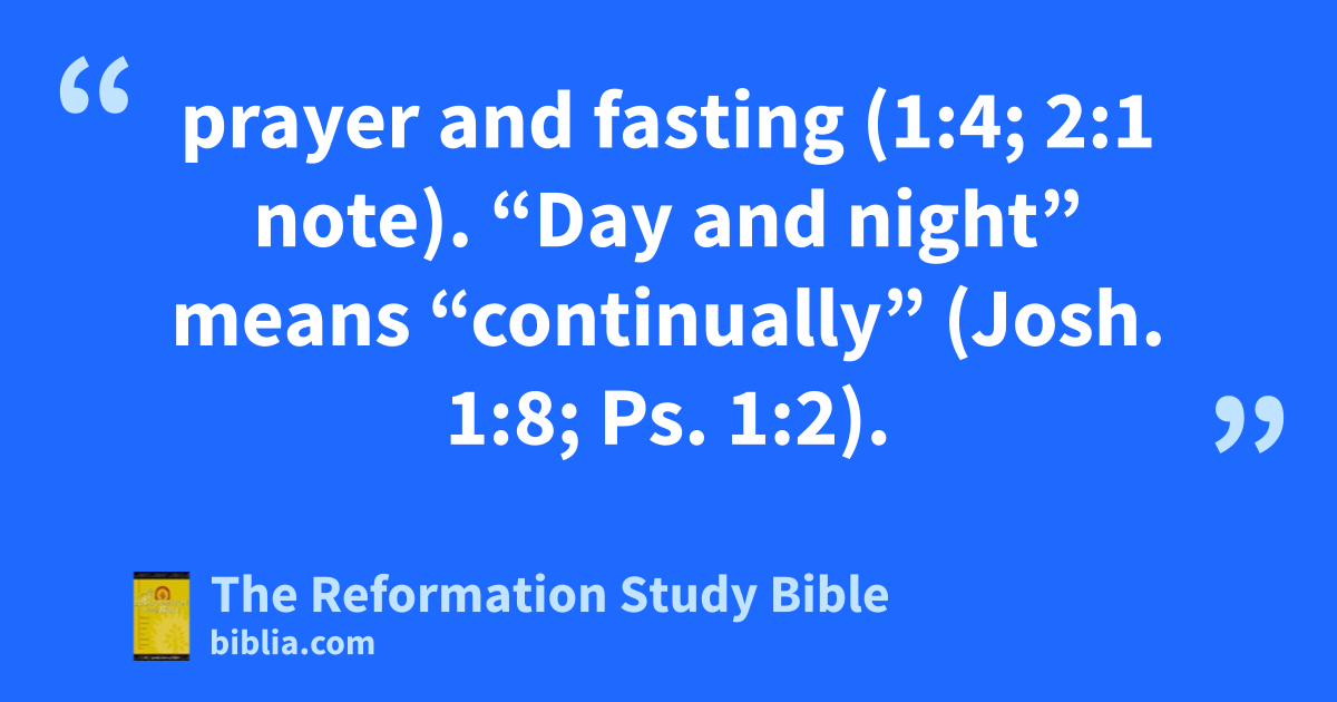 prayer and fasting (1:4; 2:1 note). “Day and night” means “continually” (Josh. 1:8; Ps. 1:2).