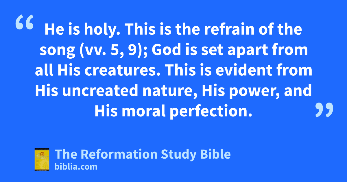 He is holy. This is the refrain of the song (vv. 5, 9); God is set apart from all His creatures. This is evident from His uncreated nature, His power, and His moral perfection.