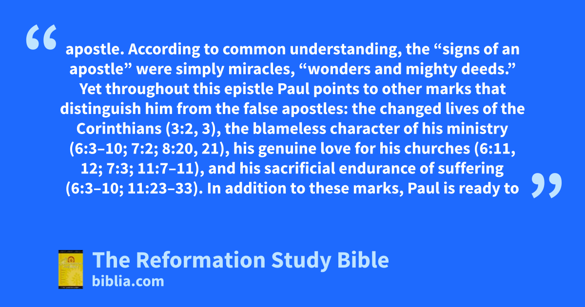 apostle. According to common understanding, the “signs of an apostle” were simply miracles, “wonders and mighty deeds.” Yet throughout this epistle Paul points to other marks that distinguish him from the false apostles: the changed lives of the Corinthians (3:2, 3), the blameless character of his ministry (6:3–10; 7:2; 8:20, 21), his genuine love for his churches (6:11, 12; 7:3; 11:7–11), and his sacrificial endurance of suffering (6:3–10; 11:23–33). In addition to these marks, Paul is ready to