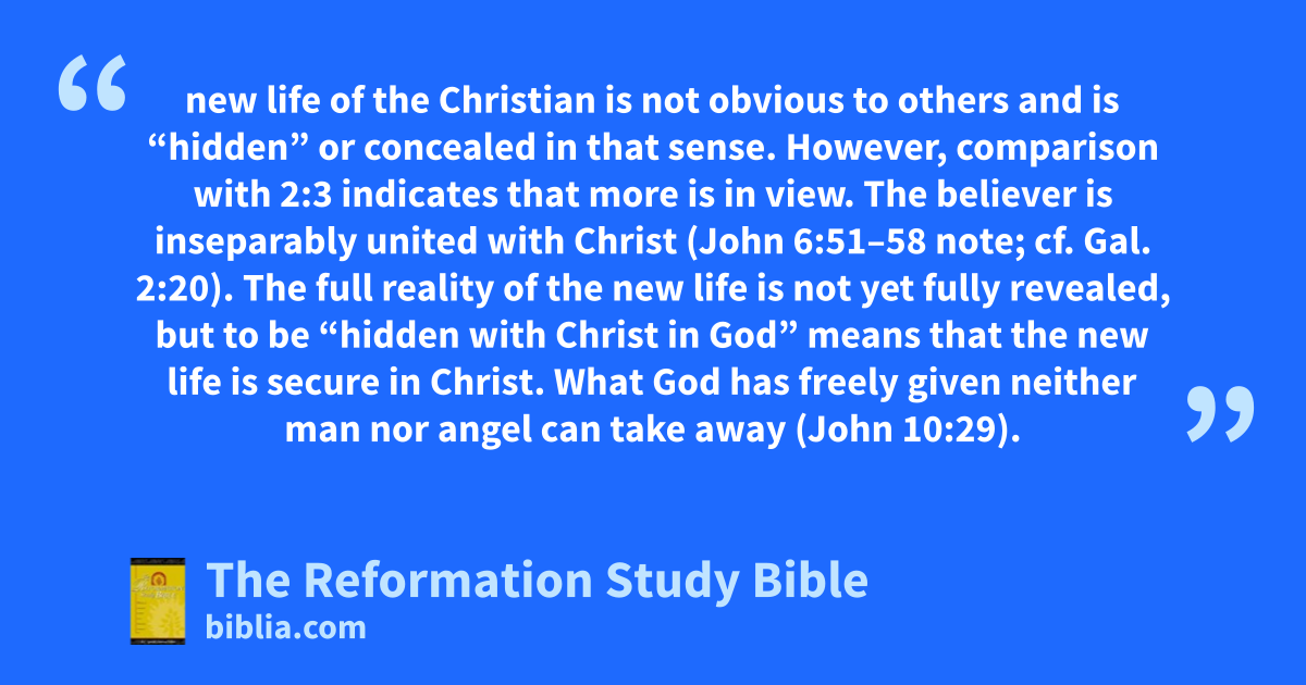new life of the Christian is not obvious to others and is “hidden” or concealed in that sense. However, comparison with 2:3 indicates that more is in view. The believer is inseparably united with Christ (John 6:51–58 note; cf. Gal. 2:20). The full reality of the new life is not yet fully revealed, but to be “hidden with Christ in God” means that the new life is secure in Christ. What God has freely given neither man nor angel can take away (John 10:29).