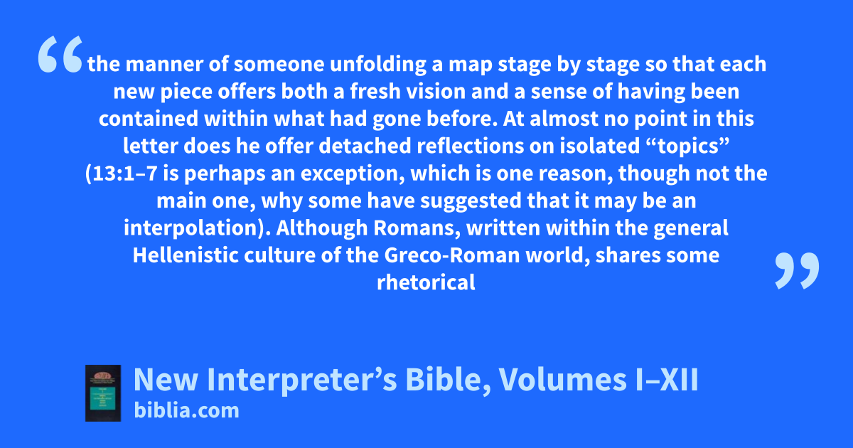 the manner of someone unfolding a map stage by stage so that each new piece offers both a fresh vision and a sense of having been contained within what had gone before. At almost no point in this letter does he offer detached reflections on isolated “topics” (13:1–7 is perhaps an exception, which is one reason, though not the main one, why some have suggested that it may be an interpolation). Although Romans, written within the general Hellenistic culture of the Greco-Roman world, shares some rhetorical
