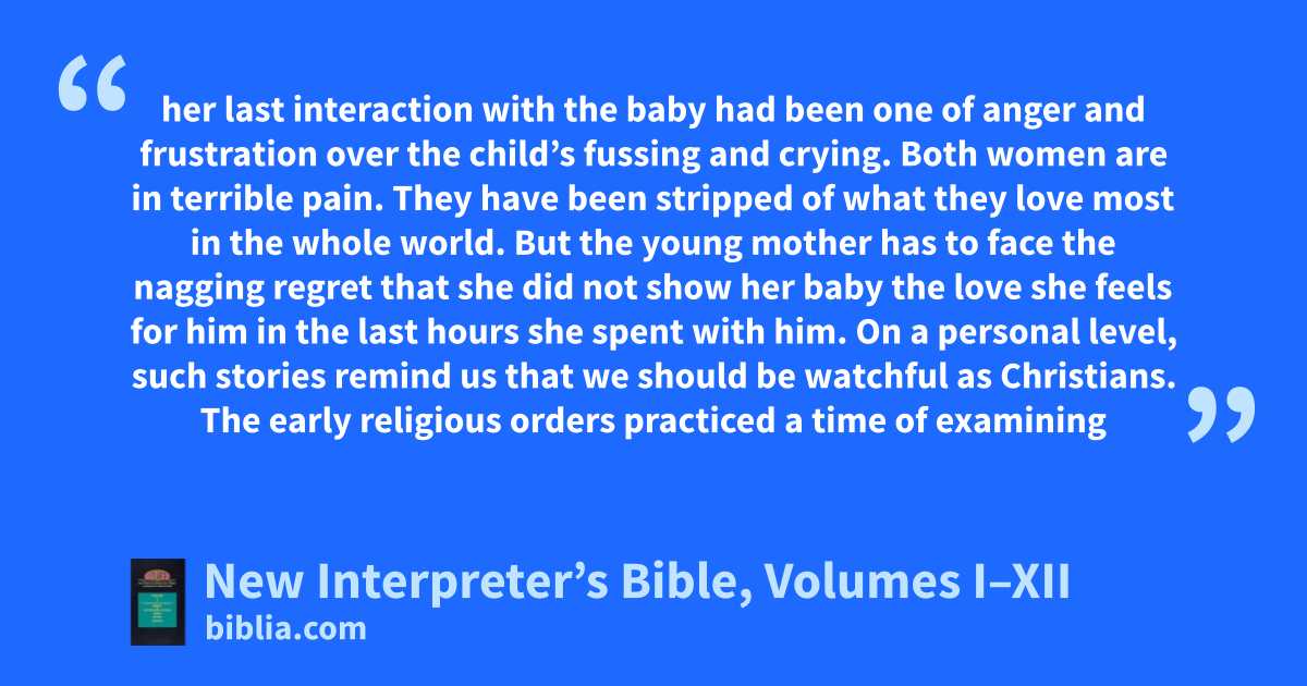 her last interaction with the baby had been one of anger and frustration over the child’s fussing and crying. Both women are in terrible pain. They have been stripped of what they love most in the whole world. But the young mother has to face the nagging regret that she did not show her baby the love she feels for him in the last hours she spent with him. On a personal level, such stories remind us that we should be watchful as Christians. The early religious orders practiced a time of examining