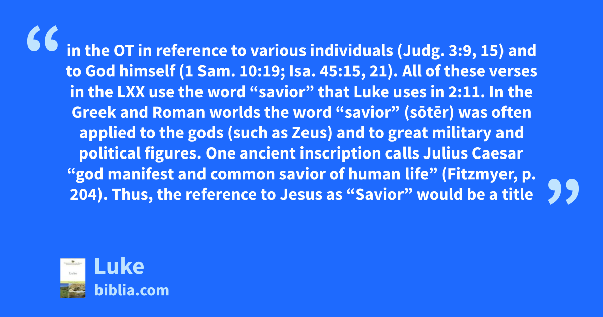 in the OT in reference to various individuals (Judg. 3:9, 15) and to God himself (1 Sam. 10:19; Isa. 45:15, 21). All of these verses in the LXX use the word “savior” that Luke uses in 2:11. In the Greek and Roman worlds the word “savior” (sōtēr) was often applied to the gods (such as Zeus) and to great military and political figures. One ancient inscription calls Julius Caesar “god manifest and common savior of human life” (Fitzmyer, p. 204). Thus, the reference to Jesus as “Savior” would be a title