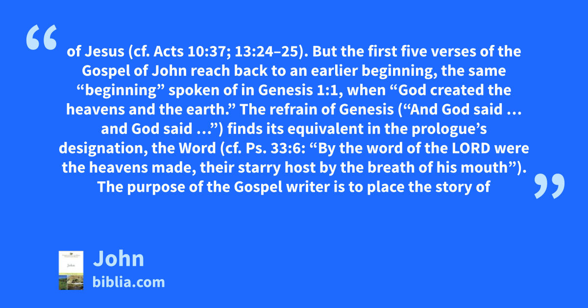 of Jesus (cf. Acts 10:37; 13:24–25). But the first five verses of the Gospel of John reach back to an earlier beginning, the same “beginning” spoken of in Genesis 1:1, when “God created the heavens and the earth.” The refrain of Genesis (“And God said … and God said …”) finds its equivalent in the prologue’s designation, the Word (cf. Ps. 33:6: “By the word of the LORD were the heavens made, their starry host by the breath of his mouth”). The purpose of the Gospel writer is to place the story of