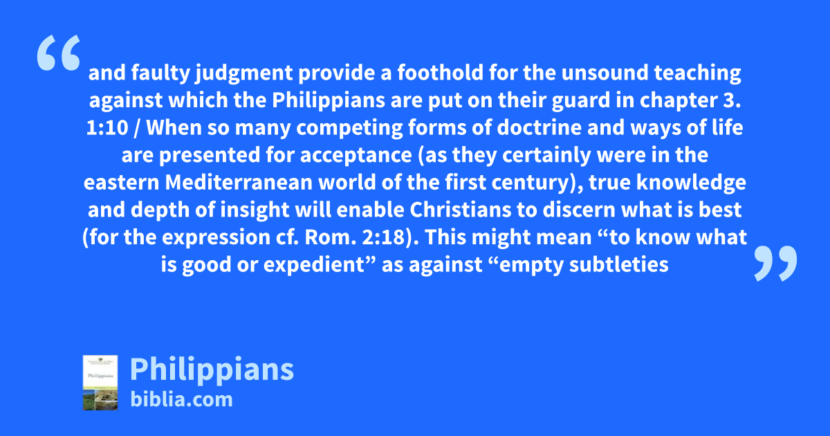 and faulty judgment provide a foothold for the unsound teaching against which the Philippians are put on their guard in chapter 3. 1:10 / When so many competing forms of doctrine and ways of life are presented for acceptance (as they certainly were in the eastern Mediterranean world of the first century), true knowledge and depth of insight will enable Christians to discern what is best (for the expression cf. Rom. 2:18). This might mean “to know what is good or expedient” as against “empty subtleties