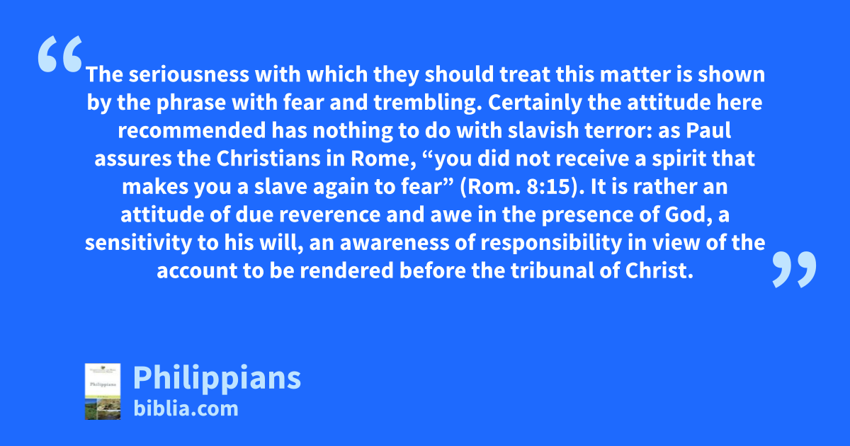 The seriousness with which they should treat this matter is shown by the phrase with fear and trembling. Certainly the attitude here recommended has nothing to do with slavish terror: as Paul assures the Christians in Rome, “you did not receive a spirit that makes you a slave again to fear” (Rom. 8:15). It is rather an attitude of due reverence and awe in the presence of God, a sensitivity to his will, an awareness of responsibility in view of the account to be rendered before the tribunal of Christ.