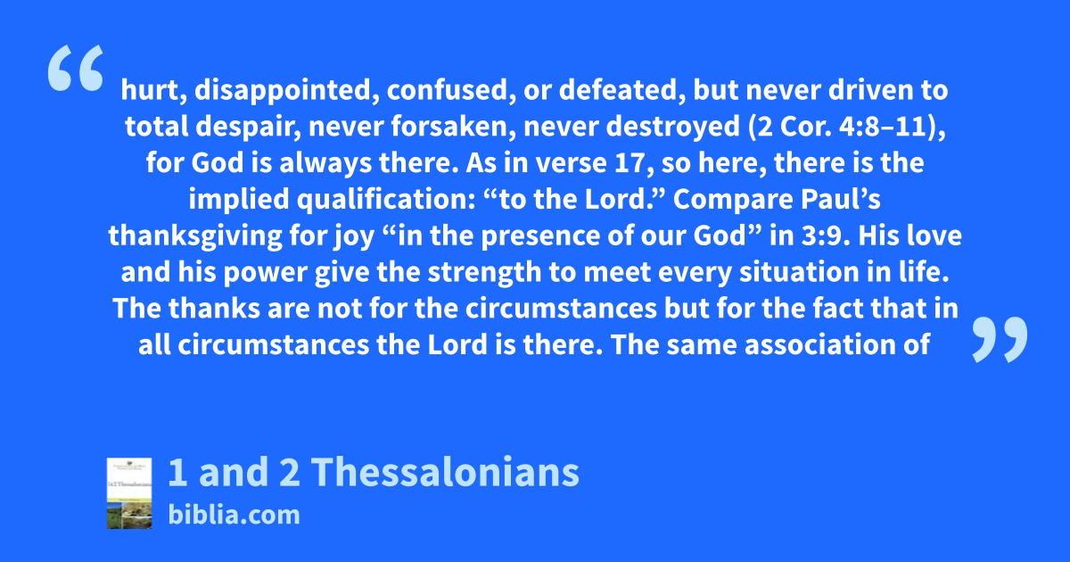 hurt, disappointed, confused, or defeated, but never driven to total despair, never forsaken, never destroyed (2 Cor. 4:8–11), for God is always there. As in verse 17, so here, there is the implied qualification: “to the Lord.” Compare Paul’s thanksgiving for joy “in the presence of our God” in 3:9. His love and his power give the strength to meet every situation in life. The thanks are not for the circumstances but for the fact that in all circumstances the Lord is there. The same association of