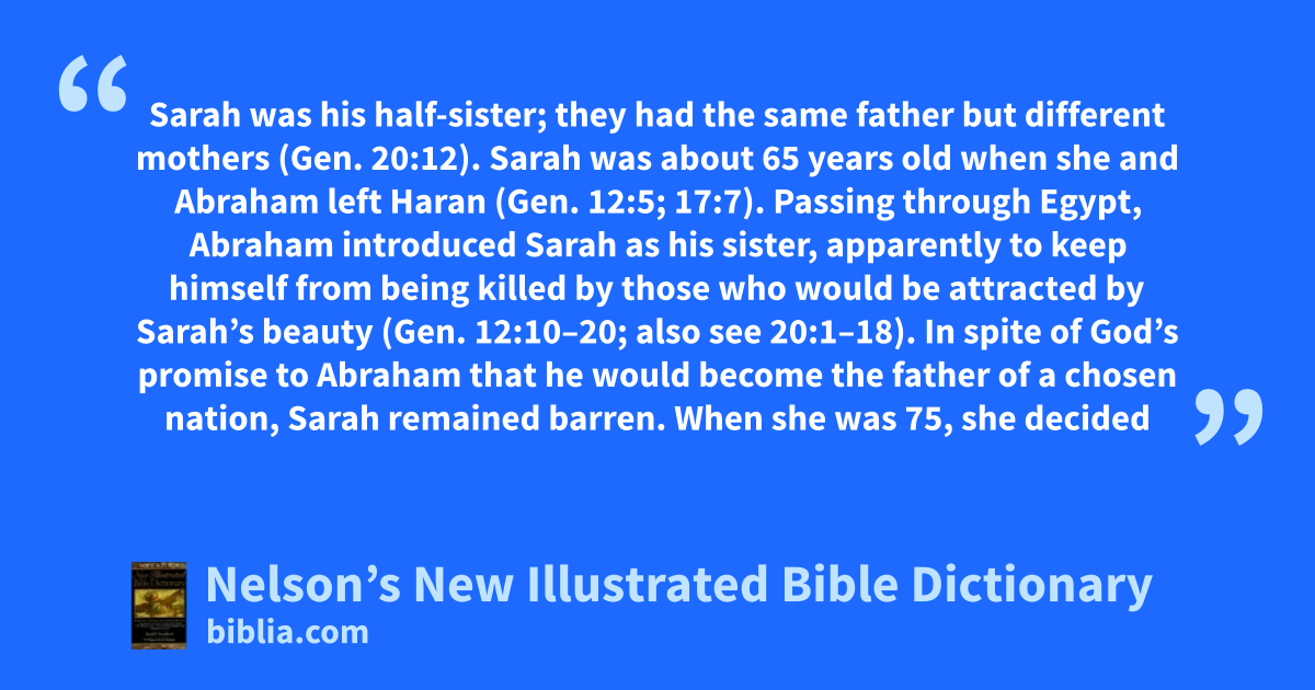 Sarah was his half-sister; they had the same father but different mothers (Gen. 20:12). Sarah was about 65 years old when she and Abraham left Haran (Gen. 12:5; 17:7). Passing through Egypt, Abraham introduced Sarah as his sister, apparently to keep himself from being killed by those who would be attracted by Sarah’s beauty (Gen. 12:10–20; also see 20:1–18). In spite of God’s promise to Abraham that he would become the father of a chosen nation, Sarah remained barren. When she was 75, she decided