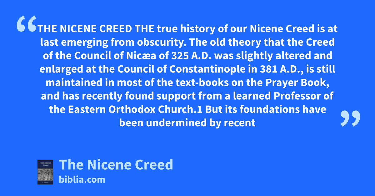THE NICENE CREED THE true history of our Nicene Creed is at last emerging from obscurity. The old theory that the Creed of the Council of Nicæa of 325 A.D. was slightly altered and enlarged at the Council of Constantinople in 381 A.D., is still maintained in most of the text-books on the Prayer Book, and has recently found support from a learned Professor of the Eastern Orthodox Church.1 But its foundations have been undermined by recent