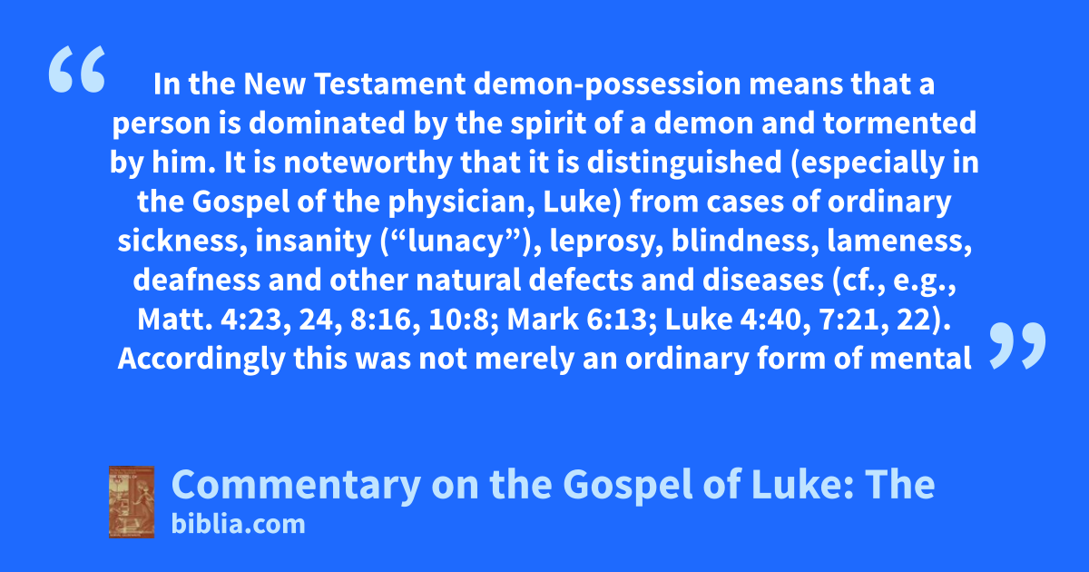 In the New Testament demon-possession means that a person is dominated by the spirit of a demon and tormented by him. It is noteworthy that it is distinguished (especially in the Gospel of the physician, Luke) from cases of ordinary sickness, insanity (“lunacy”), leprosy, blindness, lameness, deafness and other natural defects and diseases (cf., e.g., Matt. 4:23, 24, 8:16, 10:8; Mark 6:13; Luke 4:40, 7:21, 22). Accordingly this was not merely an ordinary form of mental