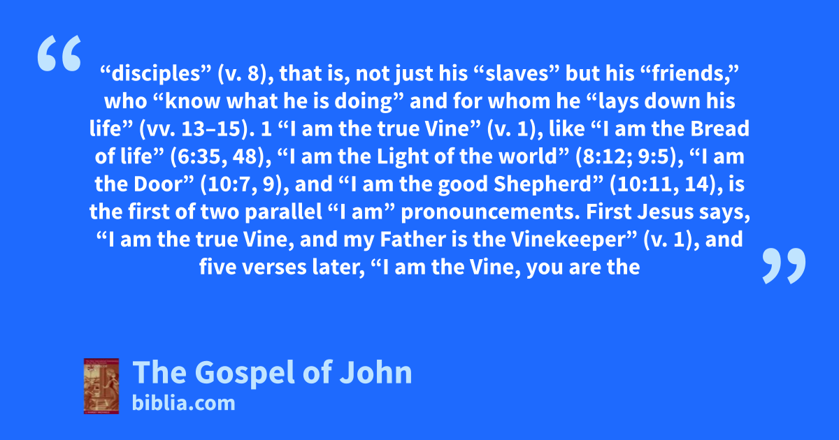 “disciples” (v. 8), that is, not just his “slaves” but his “friends,” who “know what he is doing” and for whom he “lays down his life” (vv. 13–15). 1 “I am the true Vine” (v. 1), like “I am the Bread of life” (6:35, 48), “I am the Light of the world” (8:12; 9:5), “I am the Door” (10:7, 9), and “I am the good Shepherd” (10:11, 14), is the first of two parallel “I am” pronouncements. First Jesus says, “I am the true Vine, and my Father is the Vinekeeper” (v. 1), and five verses later, “I am the Vine, you are the