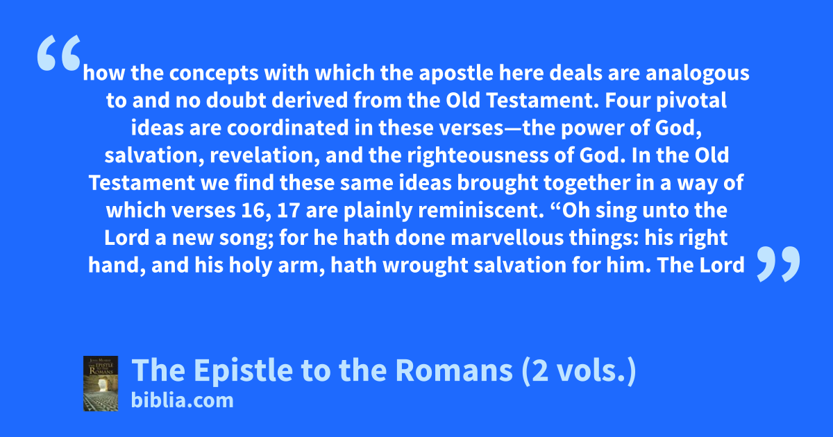 how the concepts with which the apostle here deals are analogous to and no doubt derived from the Old Testament. Four pivotal ideas are coordinated in these verses—the power of God, salvation, revelation, and the righteousness of God. In the Old Testament we find these same ideas brought together in a way of which verses 16, 17 are plainly reminiscent. “Oh sing unto the Lord a new song; for he hath done marvellous things: his right hand, and his holy arm, hath wrought salvation for him. The Lord