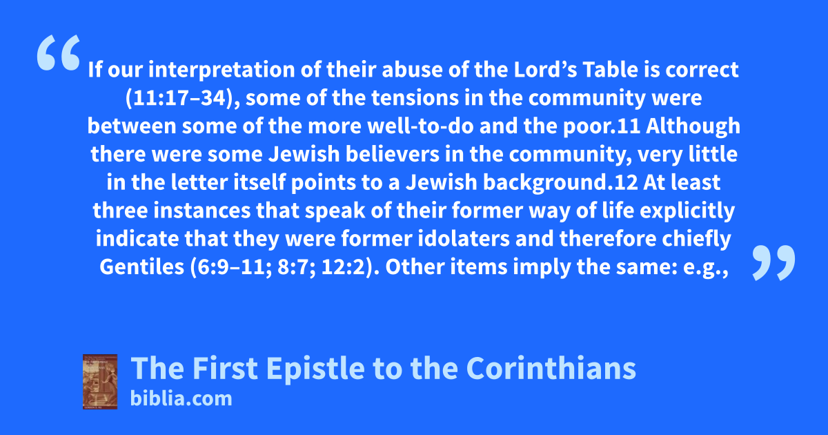 If our interpretation of their abuse of the Lord’s Table is correct (11:17–34), some of the tensions in the community were between some of the more well-to-do and the poor.11 Although there were some Jewish believers in the community, very little in the letter itself points to a Jewish background.12 At least three instances that speak of their former way of life explicitly indicate that they were former idolaters and therefore chiefly Gentiles (6:9–11; 8:7; 12:2). Other items imply the same: e.g.,