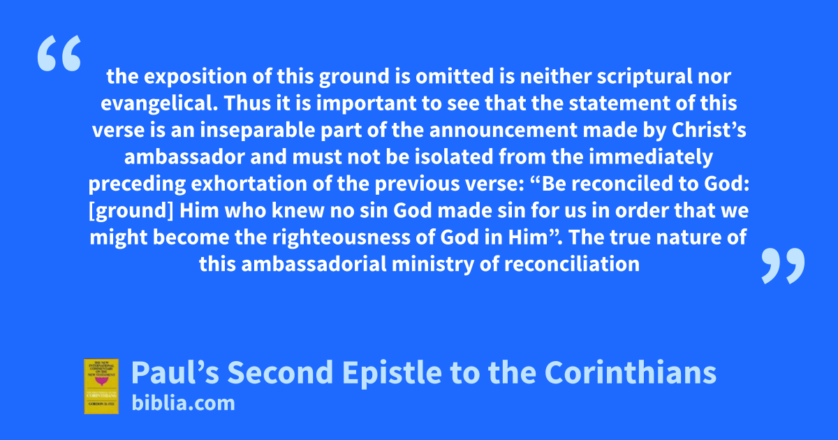 the exposition of this ground is omitted is neither scriptural nor evangelical. Thus it is important to see that the statement of this verse is an inseparable part of the announcement made by Christ’s ambassador and must not be isolated from the immediately preceding exhortation of the previous verse: “Be reconciled to God: [ground] Him who knew no sin God made sin for us in order that we might become the righteousness of God in Him”. The true nature of this ambassadorial ministry of reconciliation