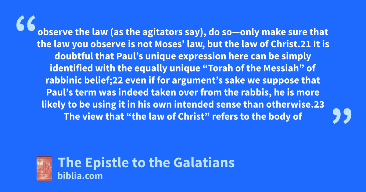 observe the law (as the agitators say), do so—only make sure that the law you observe is not Moses’ law, but the law of Christ.21 It is doubtful that Paul’s unique expression here can be simply identified with the equally unique “Torah of the Messiah” of rabbinic belief;22 even if for argument’s sake we suppose that Paul’s term was indeed taken over from the rabbis, he is more likely to be using it in his own intended sense than otherwise.23 The view that “the law of Christ” refers to the body of