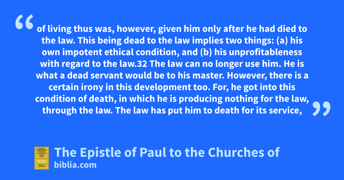 of living thus was, however, given him only after he had died to the law. This being dead to the law implies two things: (a) his own impotent ethical condition, and (b) his unprofitableness with regard to the law.32 The law can no longer use him. He is what a dead servant would be to his master. However, there is a certain irony in this development too. For, he got into this condition of death, in which he is producing nothing for the law, through the law. The law has put him to death for its service,
