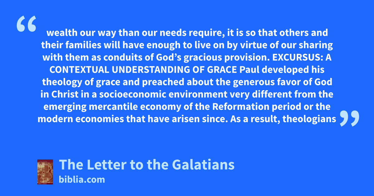 wealth our way than our needs require, it is so that others and their families will have enough to live on by virtue of our sharing with them as conduits of God’s gracious provision. EXCURSUS: A CONTEXTUAL UNDERSTANDING OF GRACE Paul developed his theology of grace and preached about the generous favor of God in Christ in a socioeconomic environment very different from the emerging mercantile economy of the Reformation period or the modern economies that have arisen since. As a result, theologians